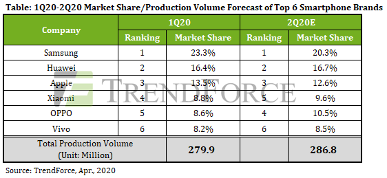 TrendForce’s figures show that Apple ranked third in terms of global smartphone market share for the first quarter of 2020, trailing Samsung and Huawei.
