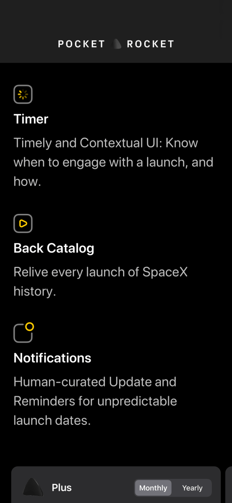 The app also includes three premium tiers with monthly and annual pricing options. Think of these as a way to not only unlock more features like push notifications for rocket launch alerts, but also your vote for more features like a native iPad app and support for other rocket company launches in Pocket Rocket.