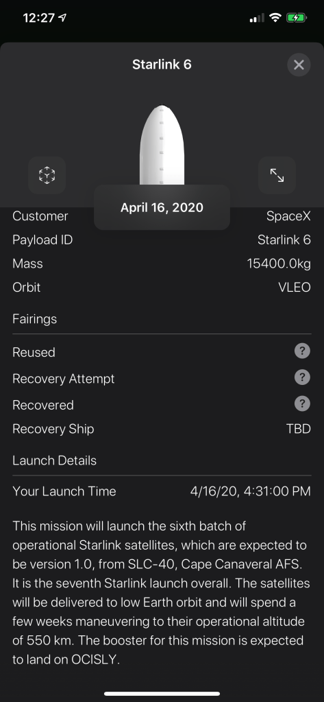 Missions are arranged by launch date in a vertical list organized chronologically, and the app is loaded with future missions. The first upcoming launch, for example, is SpaceX’s next Starlink mission later this month. This launch will deploy 60 small satellites into low Earth orbit as part of their constellation of satellites that will provide internet access around the world.