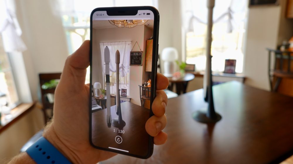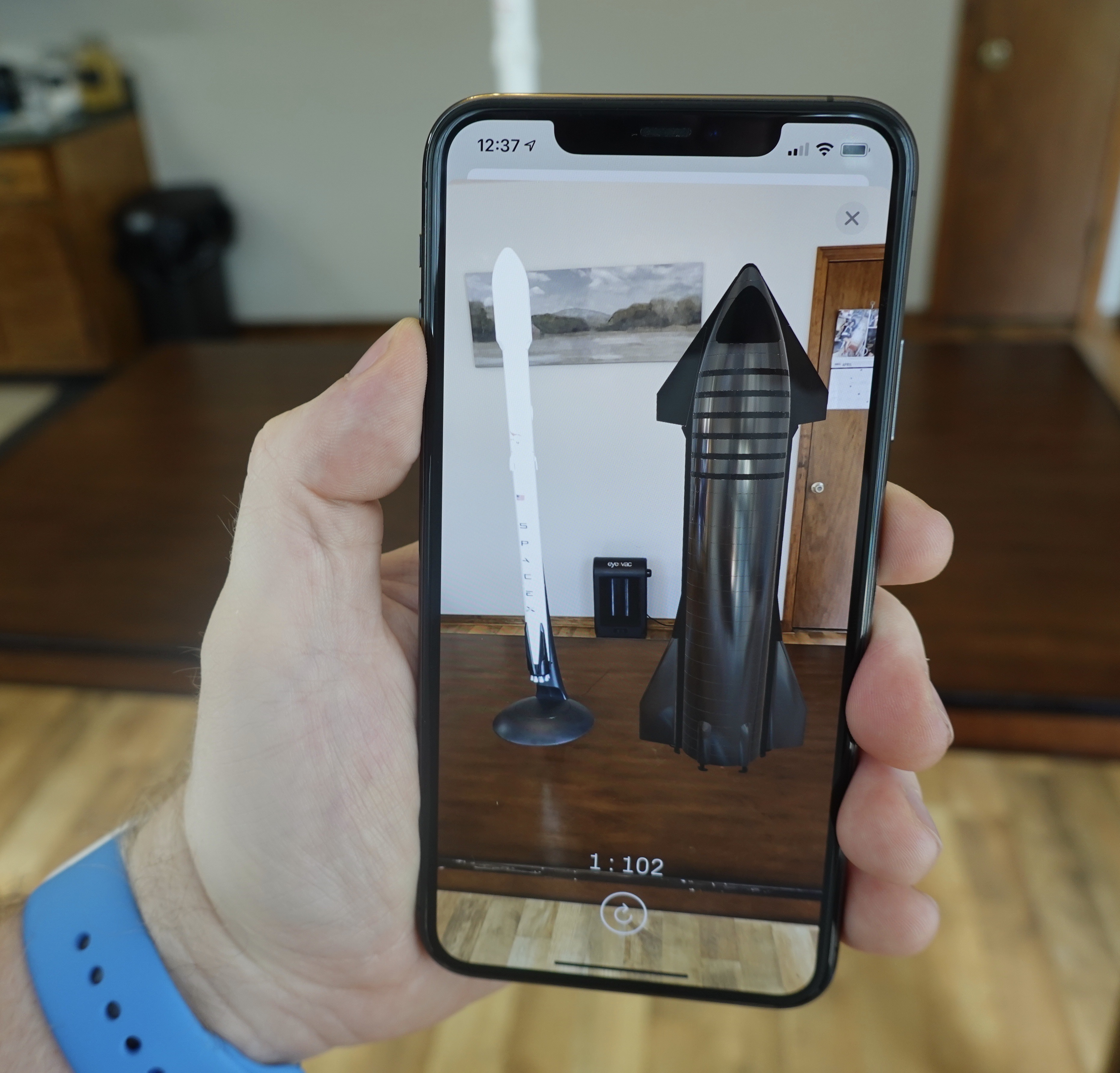 Then there’s the remarkable use of AR. Tap Apple’s AR cube icon and find a flat surface, then place your SpaceX spacecraft to a fixed location in your environment using ARKit. This powerful feature lets you walk around and see all sides of your 3D model rocket, and you can resize the AR version just like the full screen preview version.