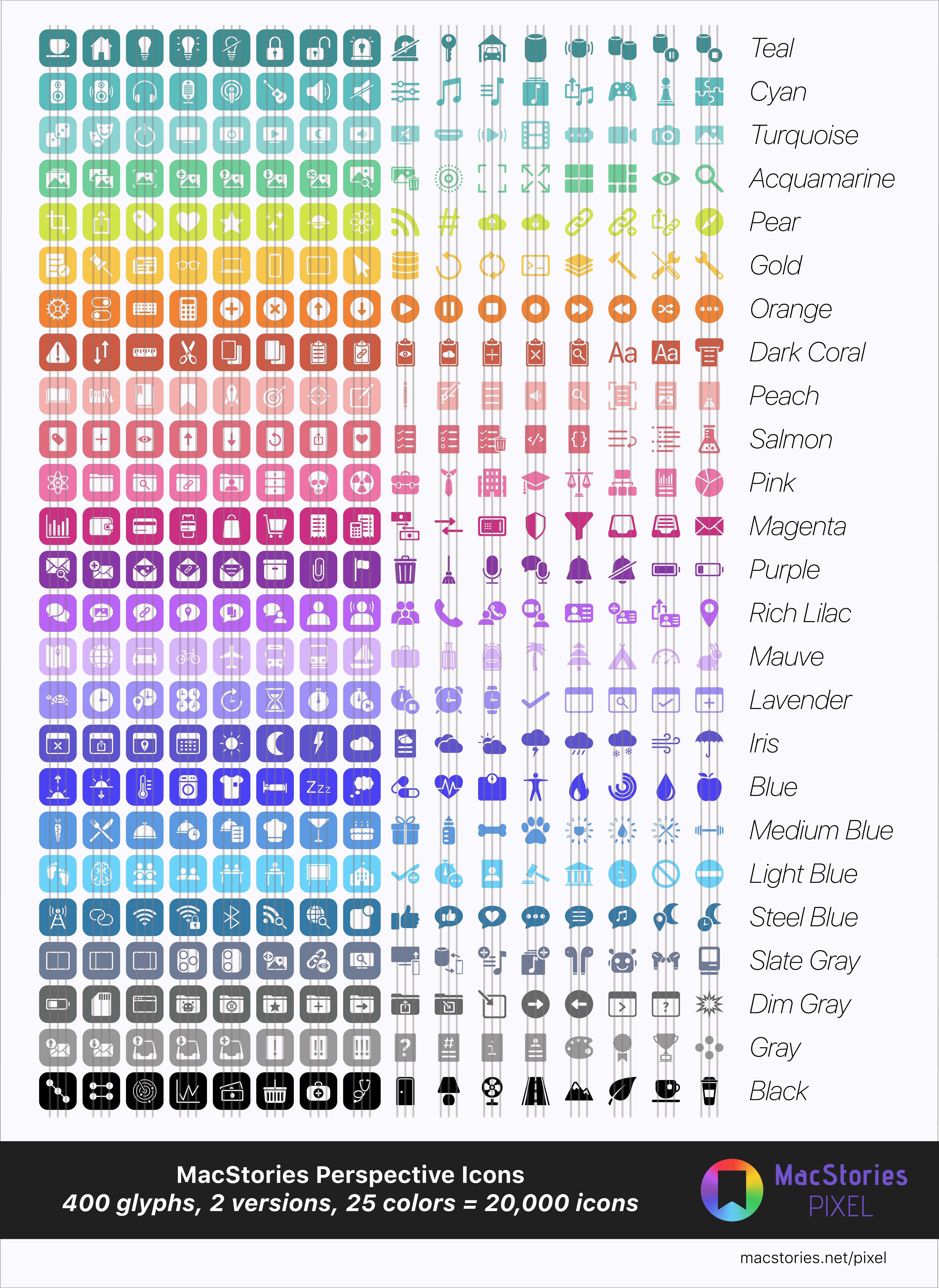 In total, the new MacStories Perspective Icons include 400 unique glyphs and each glyph is available in two versions: square and glyph-only. There are also 25 different color variations for each glyph, all of which are designed to match the OmniFocus color palette. In total, this means there are 20,000 icons included in this collection.