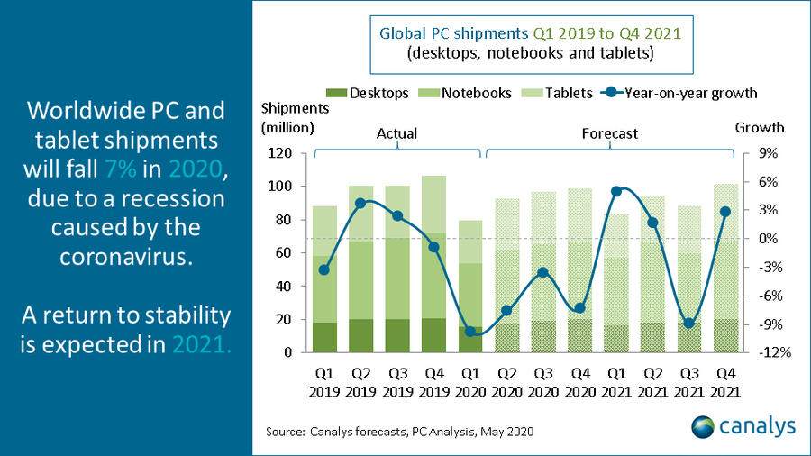 As you can see in the chart below, PC shipments fell by around 9% during Q1 of this year, and Canalys is predicting a slight boost into Q2 and Q3, but shipments are still expected to be down year-over-year. As for Q4 2020, Canalys predicts a slump due to weakened holiday demand compared to Q4 2019.