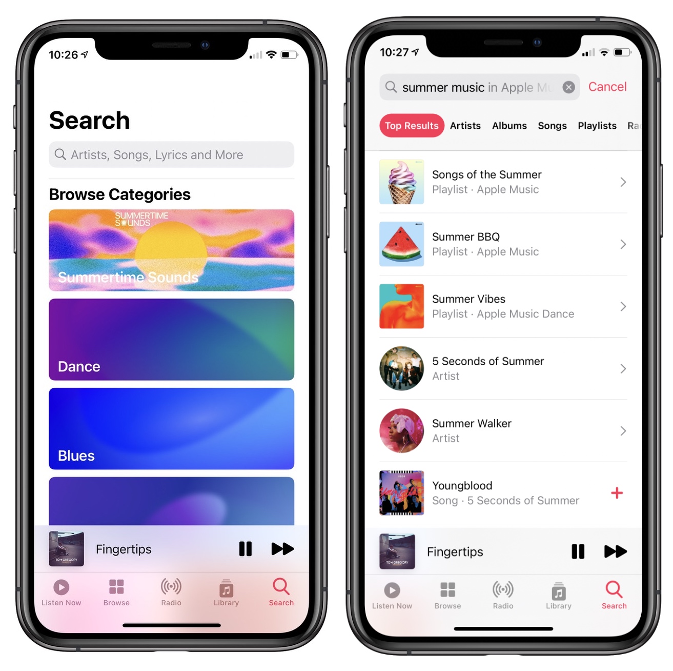 There’s also a redesigned search tab in iOS 14 Music. Popular and timely music categories are surfaced before you even type anything in, if you are looking for inspiration. The autocomplete results are richer and there’s a new look for the search results screen. Any search starts off in ‘Top Results’ which combines songs, artists, playlists, and more into a single list based on relevancy. You can easily filter down using the jump bar below the search field.