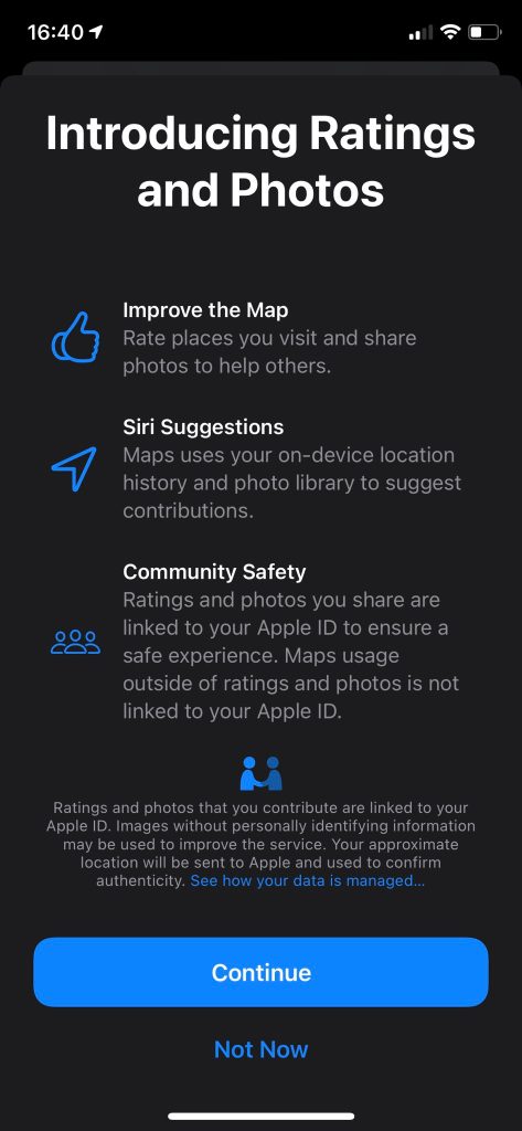 Apple is using on-device machine learning to present POI rating opportunities when it sees that someone has visited a place several times. The company will also be doing some checks to try and prevent abuse, such as only accepting ratings from people that have physically visited the place.
