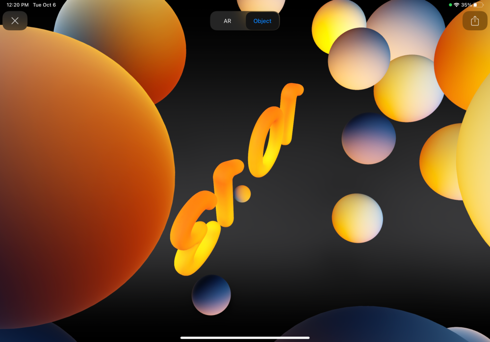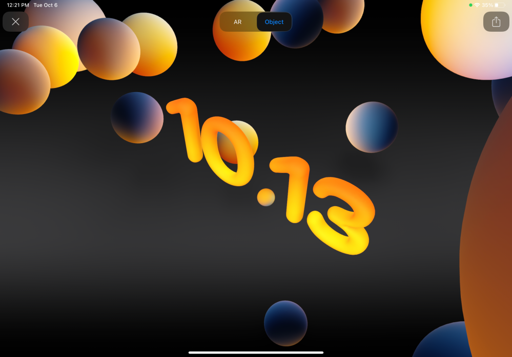 The fun little AR experience Easter egg shows an interactive animation that morphs from the floating golden/orange/blue circles in an explosion to many floating orbs with the “10.13” event date in the center in orange.