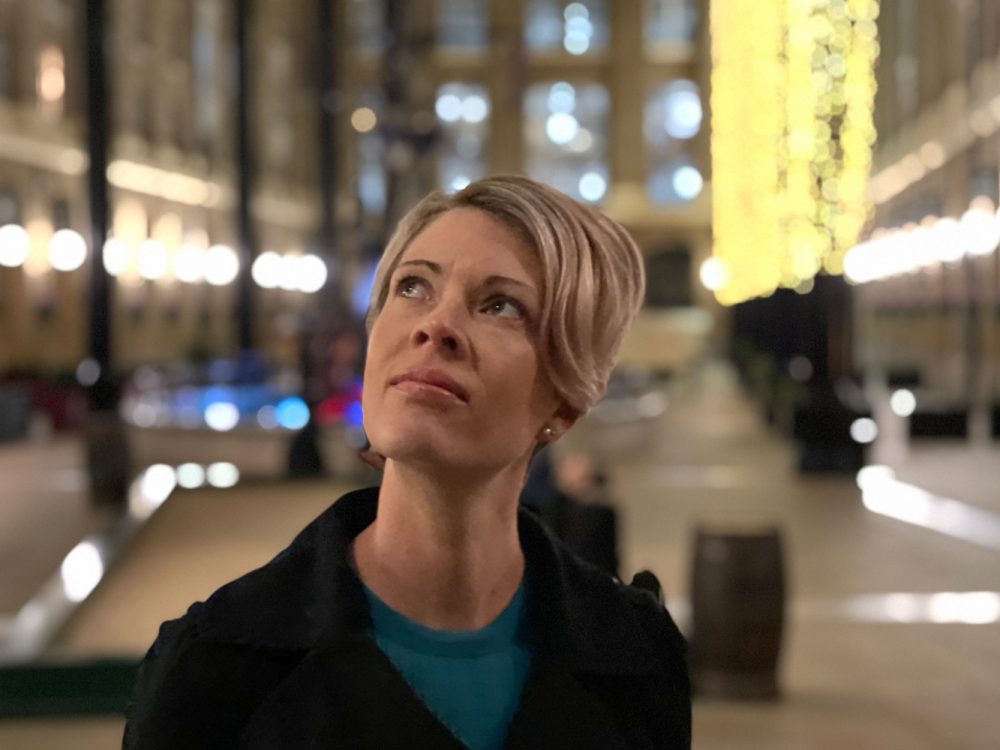 Here’s an example of the opposite issue: Caroline is lit by rather warm lighting through an office window, while the rainy background has cooler lighting.