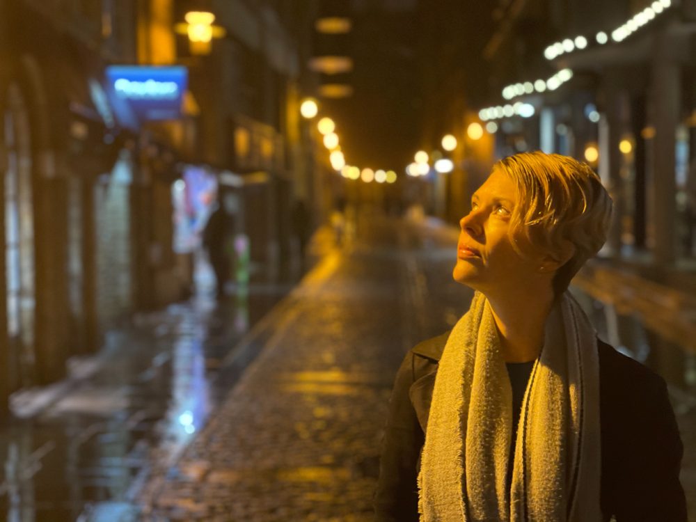 Caroline is lit by a very warm street lamp, and the same street lamps continue off down the street behind her, and are also reflected in the wet stone. That consistent color temperature across foreground, midground, and background means that the photo has a very natural appearance. It’s honestly hard to see here that the bokeh is artificial.
