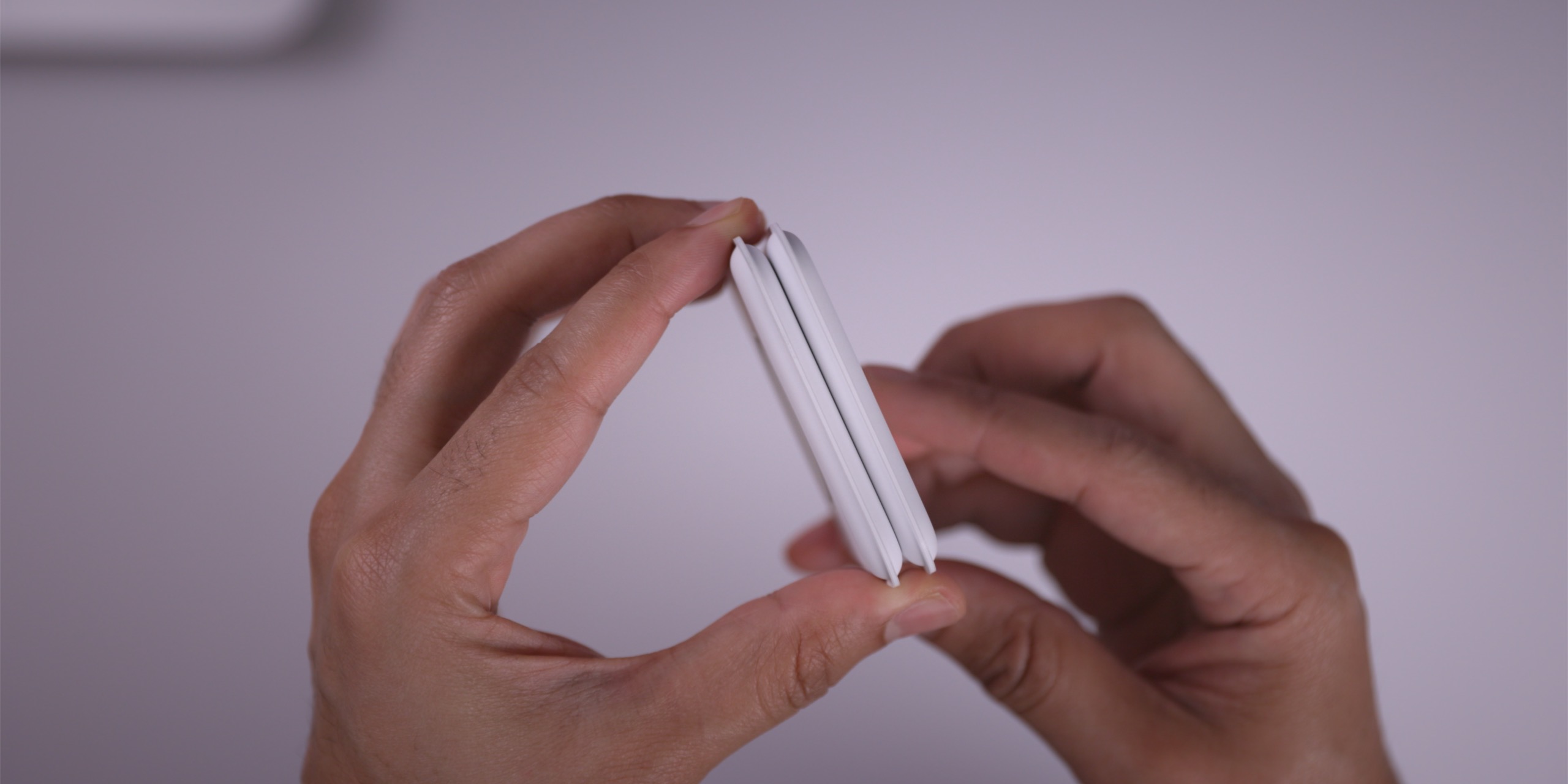 The MagSafe Duo charge features a soft-touch silicone surface in an off white color. The middle of the charger features a flexible area that can be folded in half for easy storage. There are two charging surfaces on the top of the MagSafe Duo Charger — a standard MagSafe Wireless Charging connector, and a pivoting Apple Watch puck-style connector. Behind the Apple Watch charger, you’ll find the Lighting input for connecting the USB-C to Lightning cable, and underneath the MagSafe surface, you’ll find a subtle embossed Apple logo.