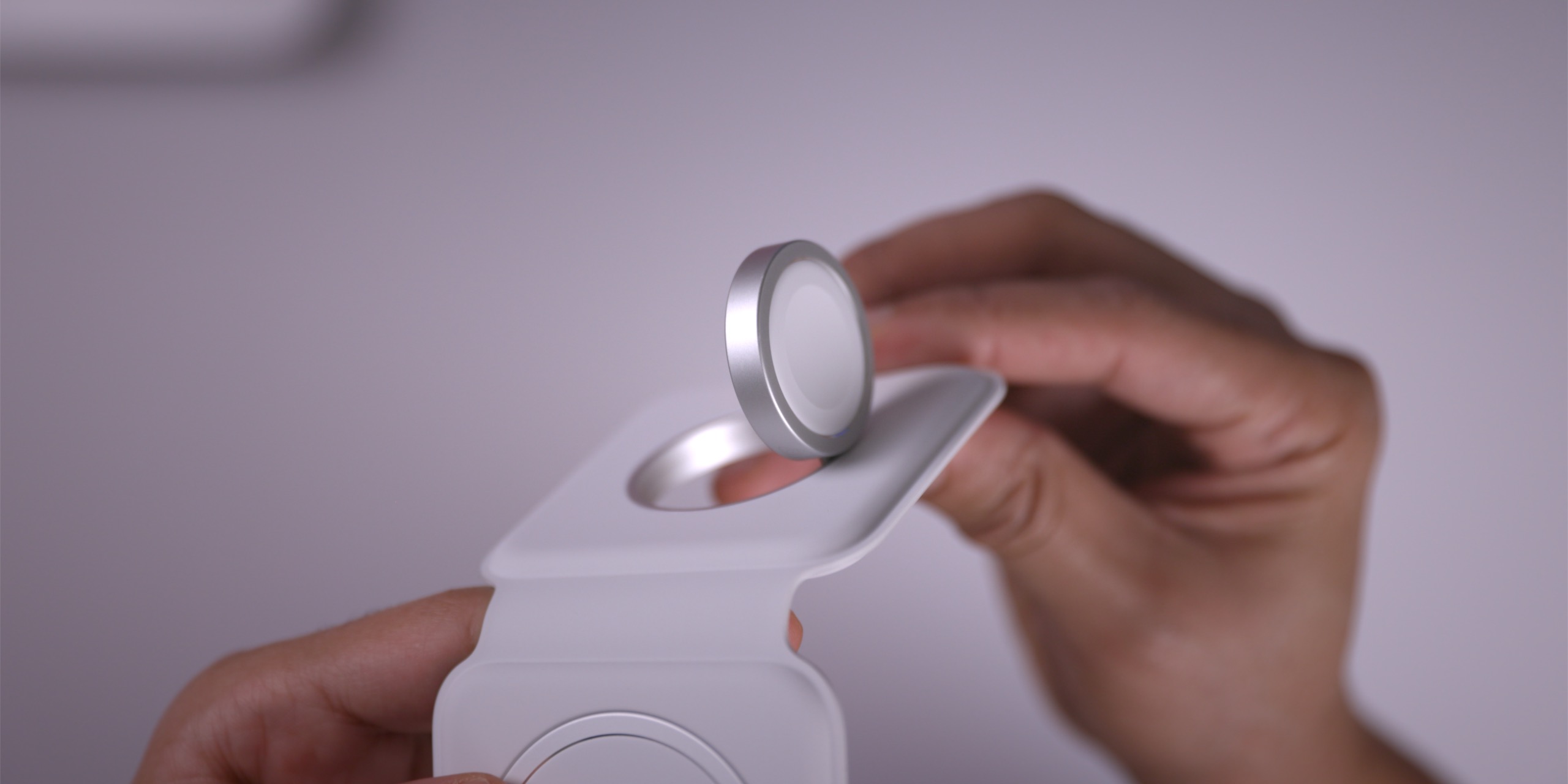 On the right side of the MagSafe Duo Charger is where you will find the Apple Watch puck charger. Like the Apple Watch Magnetic Charging Dock introduced several years back, the MagSafe Duo Charger’s Apple Watch connection can lie flat or can pivot 90 degrees via a built-in metal hinge to accommodate watchOS’ Nightstand mode.