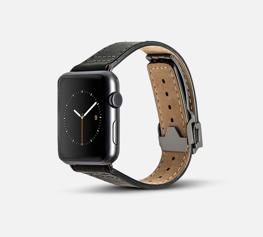 The Monowear leather deployant band is made from genuine leather and comes in four stylish colors; desert, brown, black and navy. Its slim profile lays flat on your wrist and the slick clasp snaps and unsnaps in an instant. The band is finished off with stainless steel lugs to connect your Apple Watch, and you can choose the color of lugs to complement your personal Apple Watch casing.