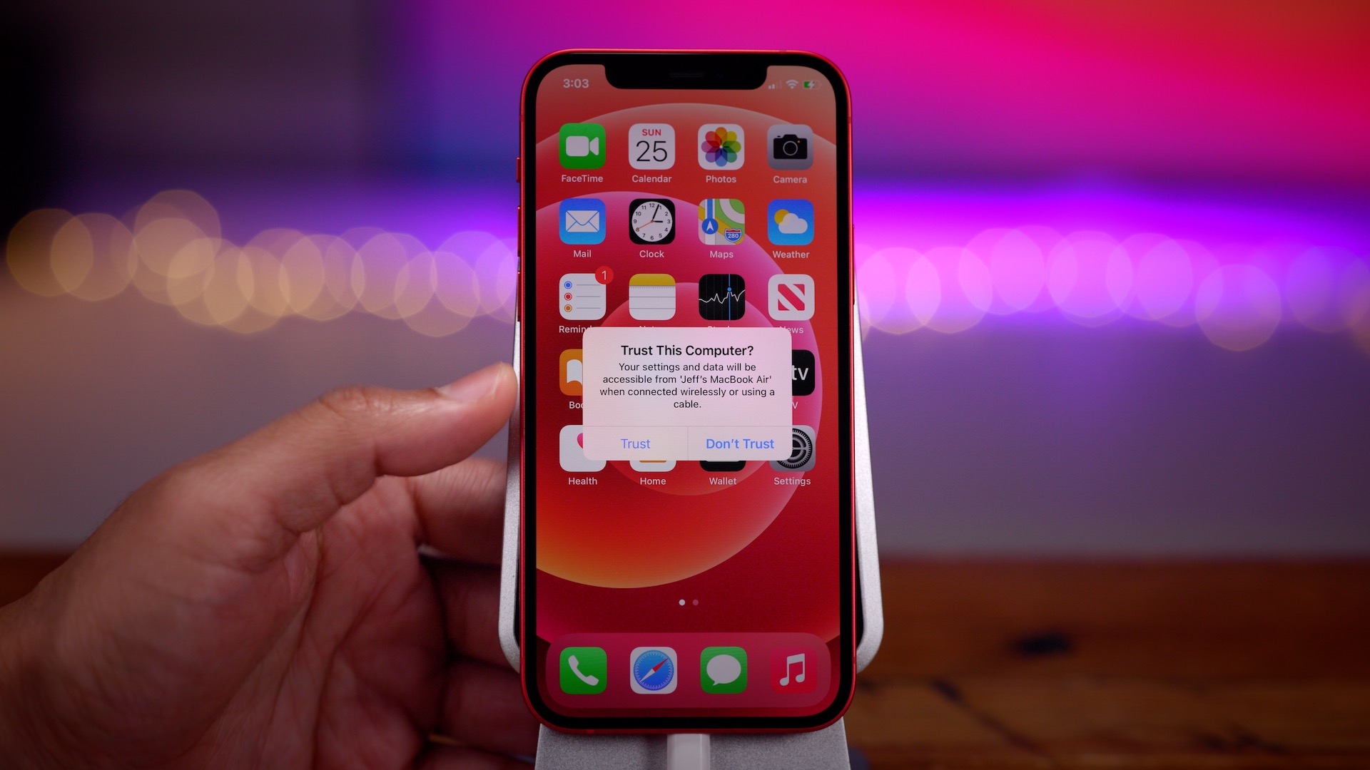 Step 1: Connect your iPhone to your computer with a Lightning to USB cable. If this is your first time connecting your iPhone to this computer, you’ll need to tap the Trust button that appears on the Trust This Computer dialogue that appears. You’ll then have to enter your passcode on your iPhone to confirm the pairing.