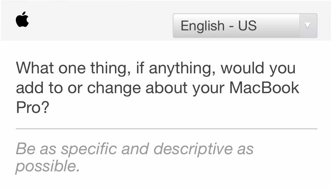 I picked up the 13-inch base MacBook Pro and happened to get the Apple survey. It’s quite a long one and included many questions. But the most interesting is one of the final questions: “What one thing, if anything, would you add to or change about your MacBook Pro?”