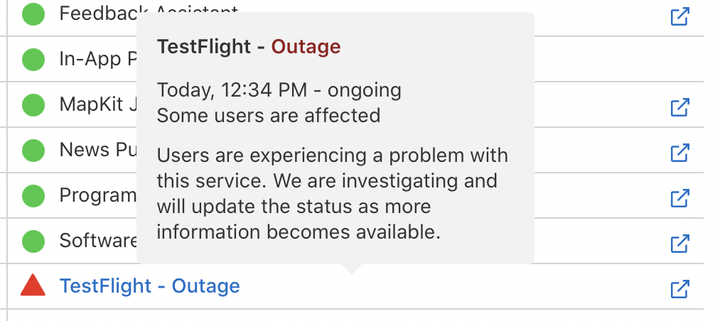 For the TestFlight outage Apple says: “Some users are affected” and that “Users are experiencing a problem with this service. We are investigating and will update the status as more information becomes available.”