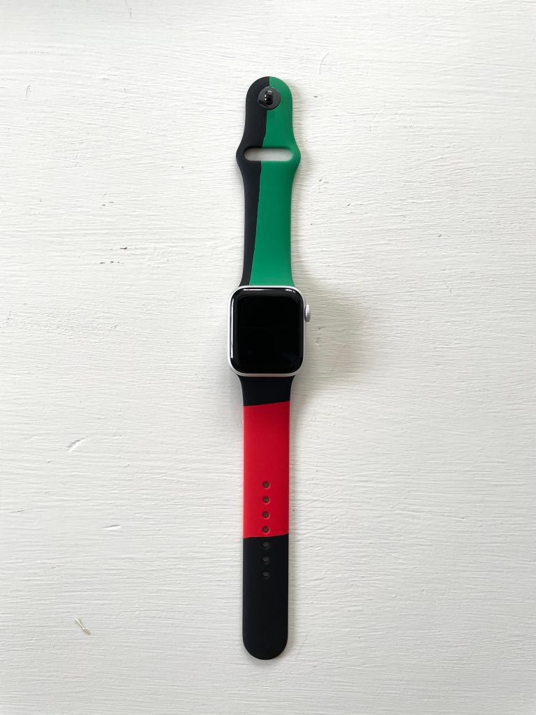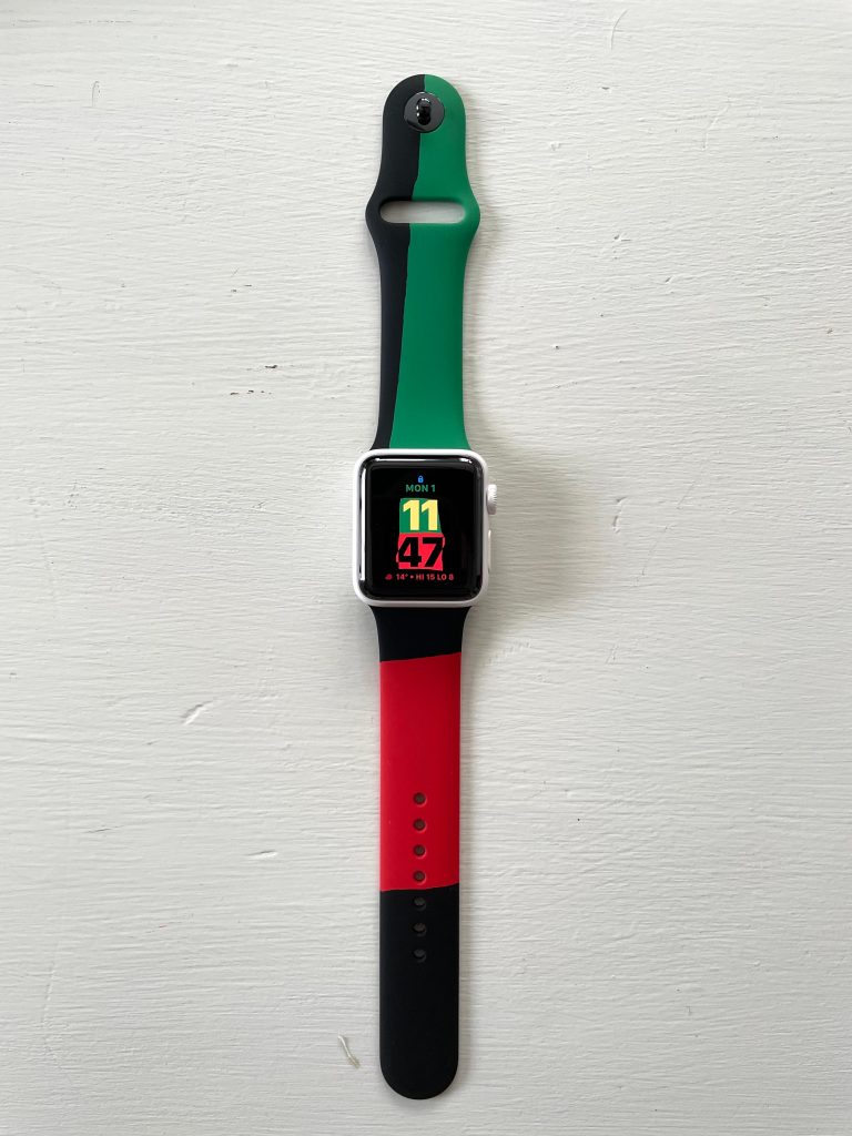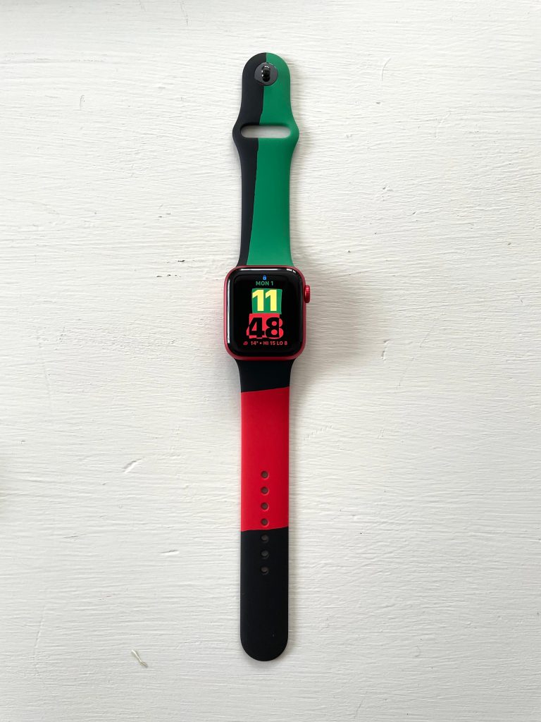The band itself is quite beautiful. It has these slick color-blocked areas that sweep across different parts of the band. On the pin side of the band, Apple has used green, and on the hole side of the band they’ve used red. These colors are of course an homage to the Pan-African flag.