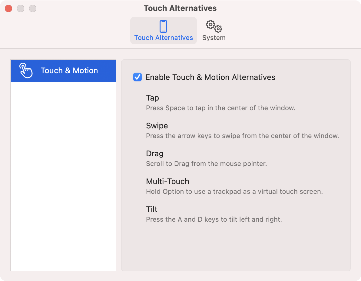 Other changes include an updated Touch Alternative menu and a new System panel: