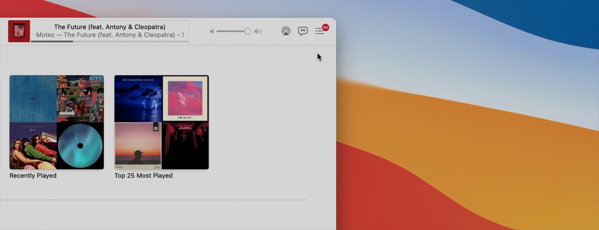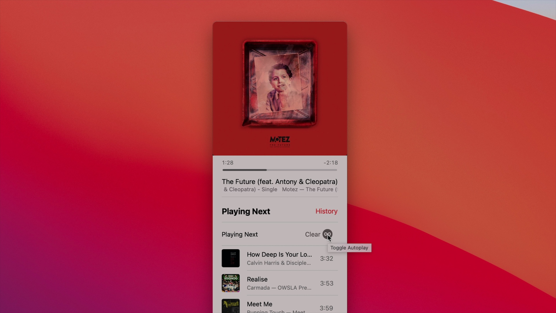 With Autoplay on and the Queue closed, you’ll notice a red Autoplay symbol in the upper right-hand corner of the Queue button. This helps the user to realize that Autoplay is enabled, even when the queue is closed. This same indicator carries over to Music app’s compact mode.