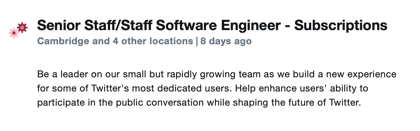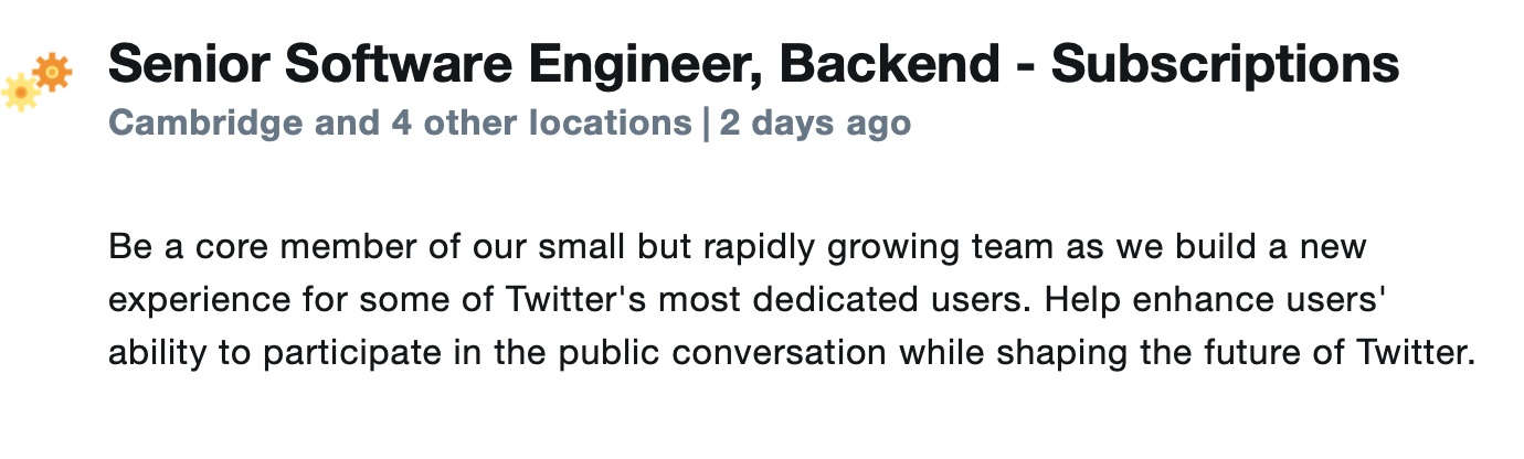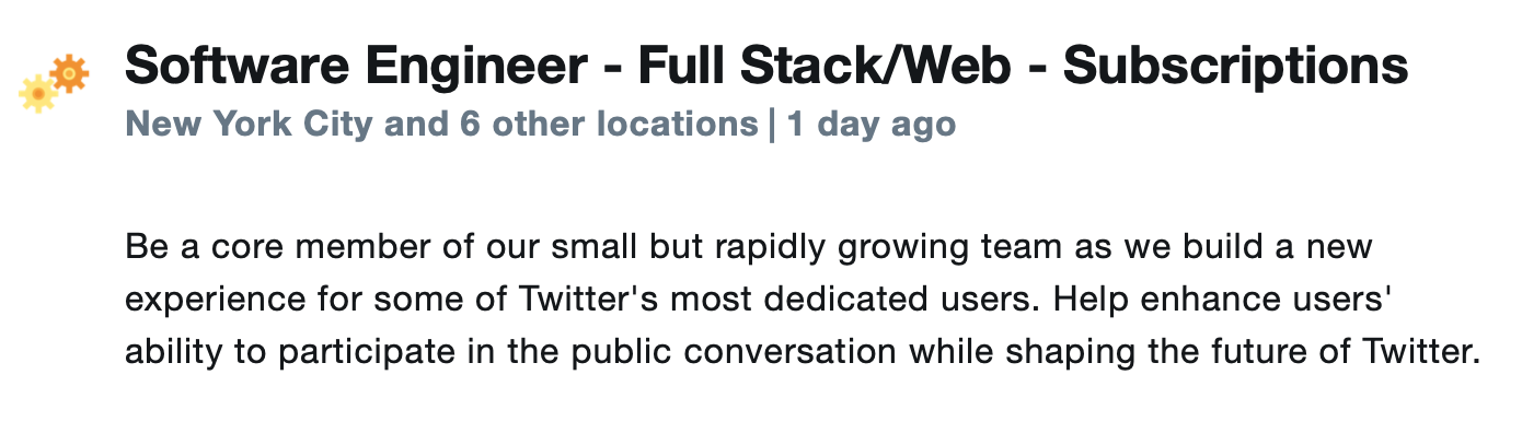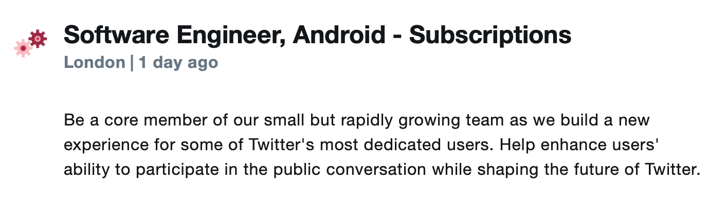 The new Software Engineer, iOS – Subscriptions is live here at the time of writing. You can find all of the open subscription roles by heading to careers.twitter.com and using the search filter.