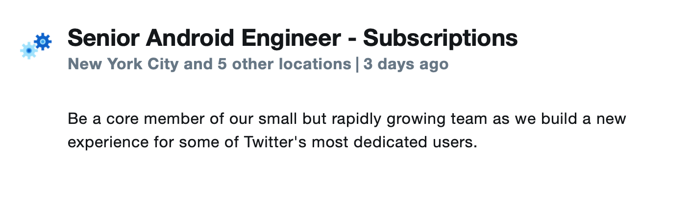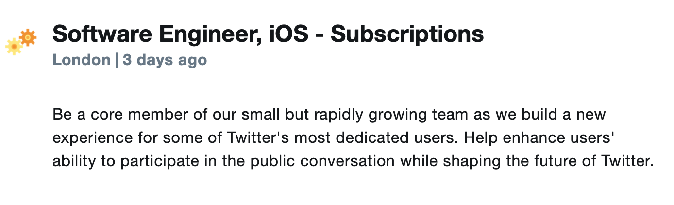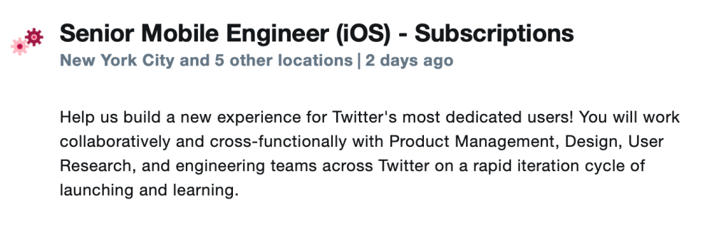 Will Sigmon first spotted the latest Twitter role that first appeared three days ago (this is an additional job since Simon Størving found a Senior iOS engineer role for Subscriptions earlier this month). Here’s the job description for the new “Software Engineer, iOS – Subscriptions” position: