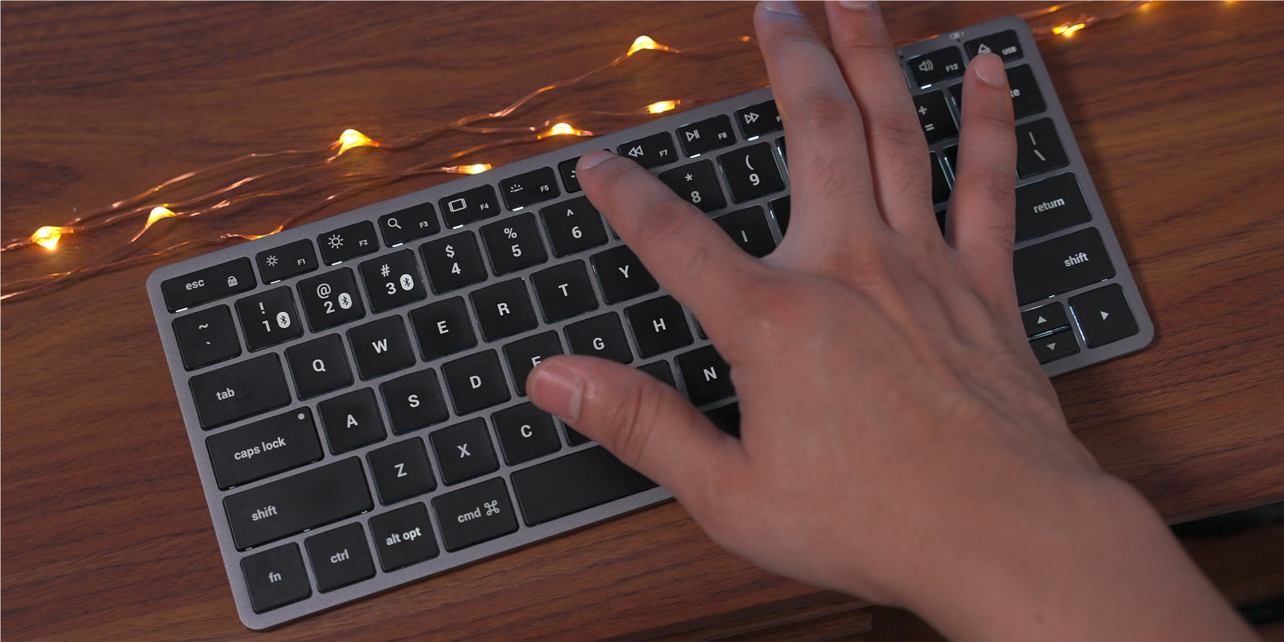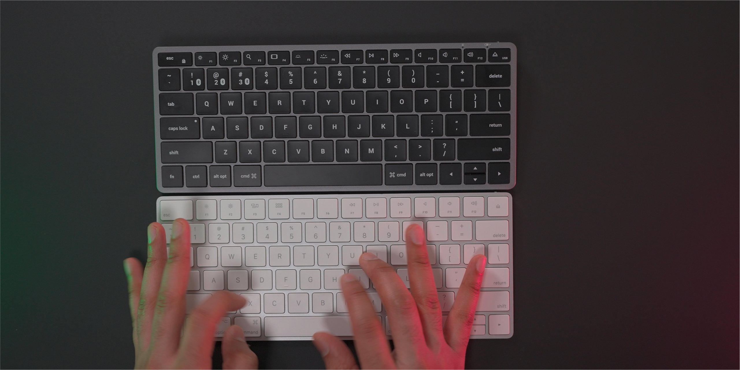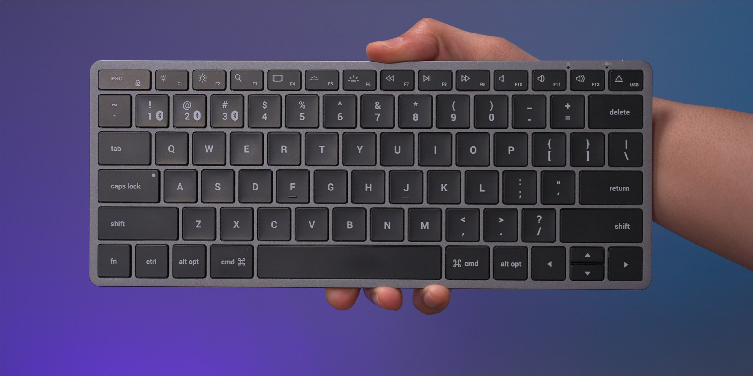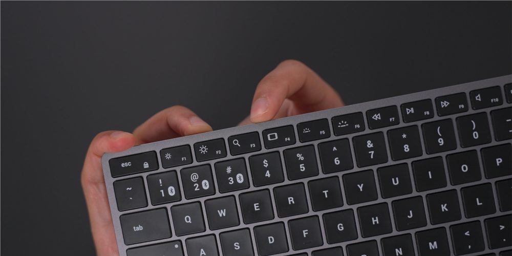 A simple long-press of one of the three Bluetooth buttons along with the Function key will place the device into pairing mode. Once paired with your devices, it’s just a matter of pressing the Bluetooth button + Function key combo to quickly switch between a Mac, iPad, iPhone, etc. Outside of the backlight capabilities, this is the biggest reason to choose the Slim X1 over the Magic Keyboard.