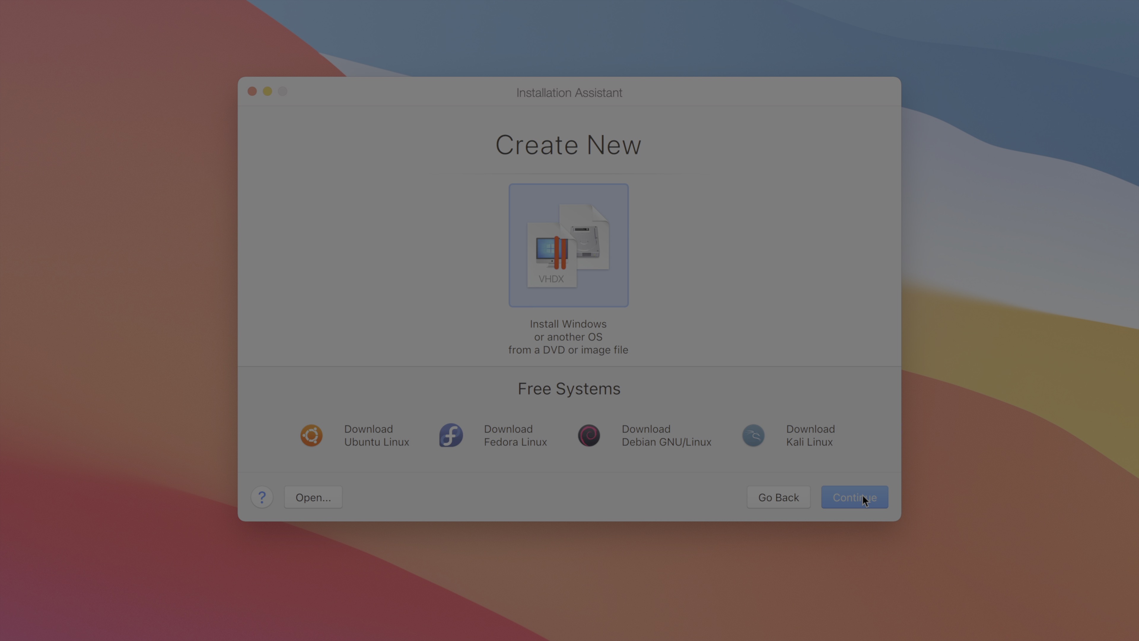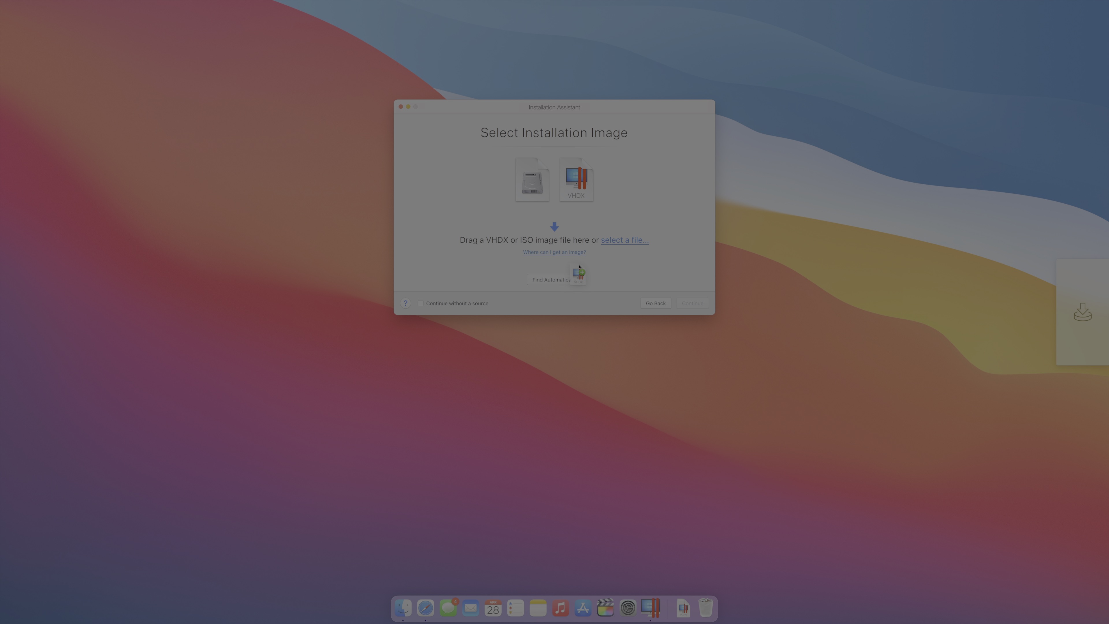 - If choosing manually, drag the Windows 10 VHDX image file to the Select Installation Image window and click Continue.