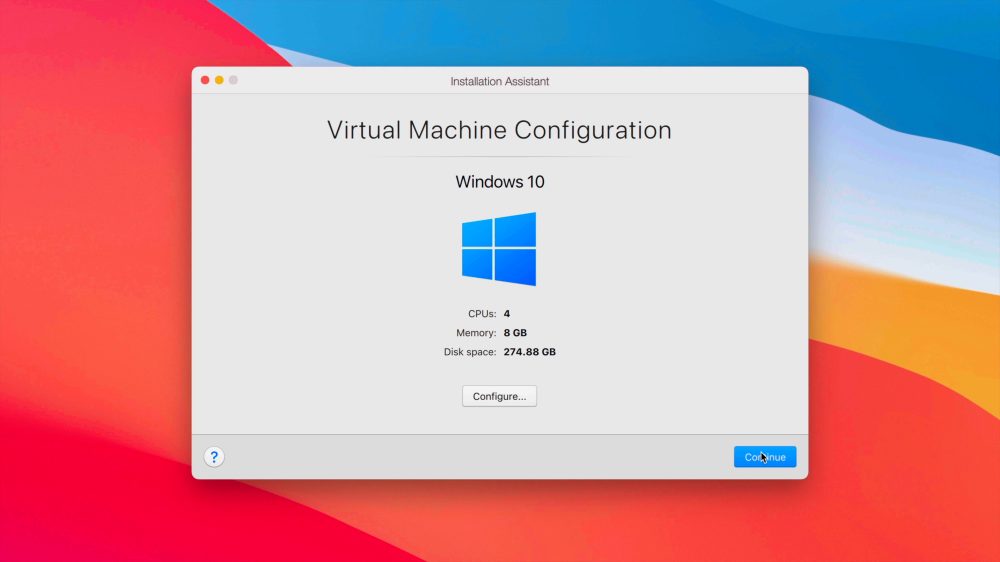 - Click continue on the Virtual Machine Configuration page to commence the Windows 10 installation on your M1 Mac.
