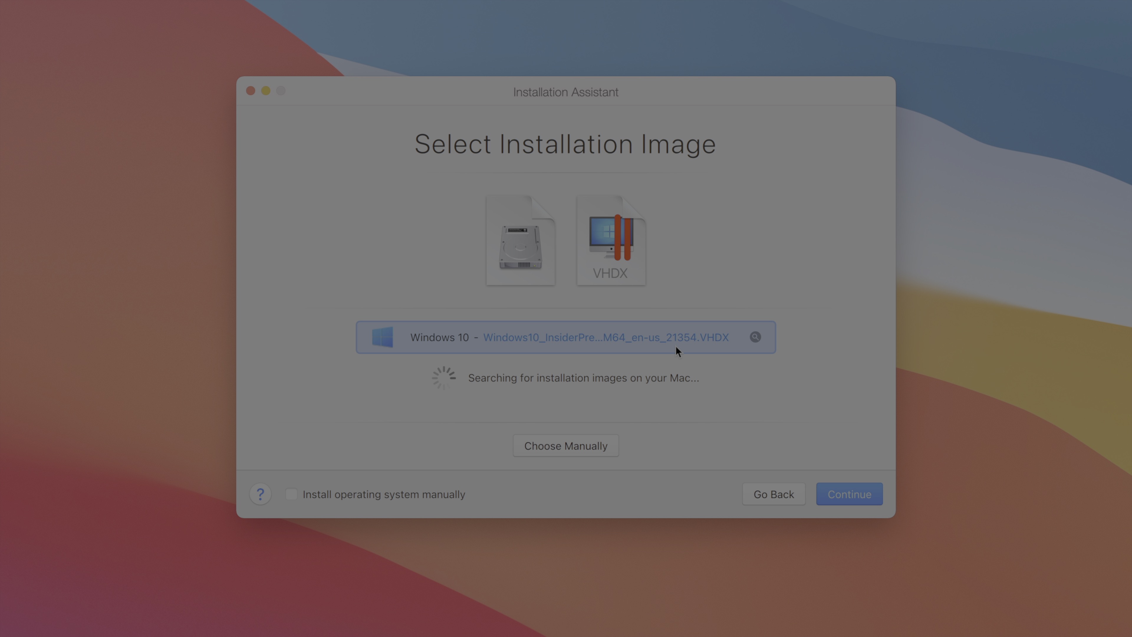 Parallels will automatically search out the Windows install image on the Select Installation Image window. If it finds the Windows 10 .VHDX file that you downloaded in Step 3, click Continue. Otherwise, click the Choose Manually button.