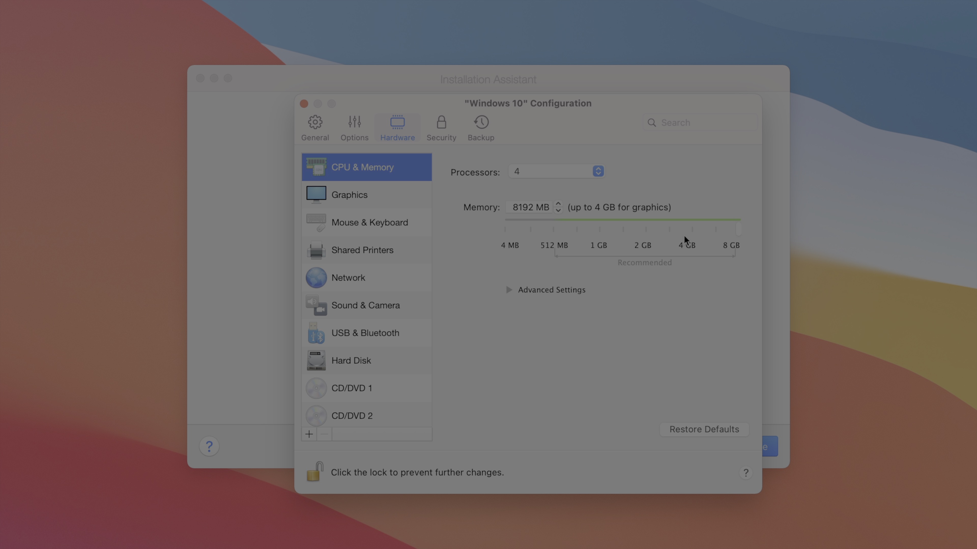 Parallels Installation Assistant will now create the virtual machine, which will take a few seconds. Eventually the Configuration window will appear, allowing you to customize the amount of memory and CPU cores allocated to the virtual machine.