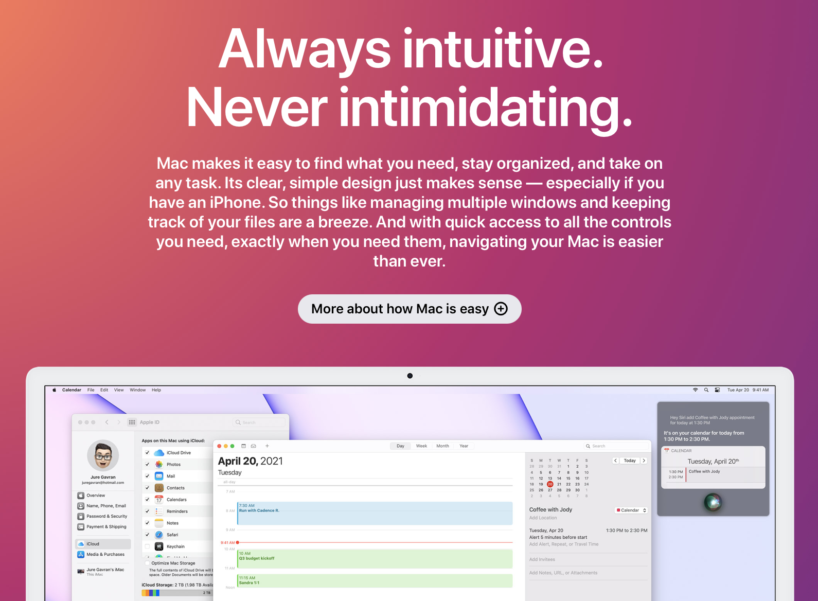 Easy to learn. Astoundingly powerful. And designed to let you work, play, and create in ways you never imagined. It’s the computer that comes packed with apps that are ready to go right out of the box. Free, regular software updates keep things up to date and running smoothly. And if you already have an iPhone, it feels familiar from the moment you turn it on.
