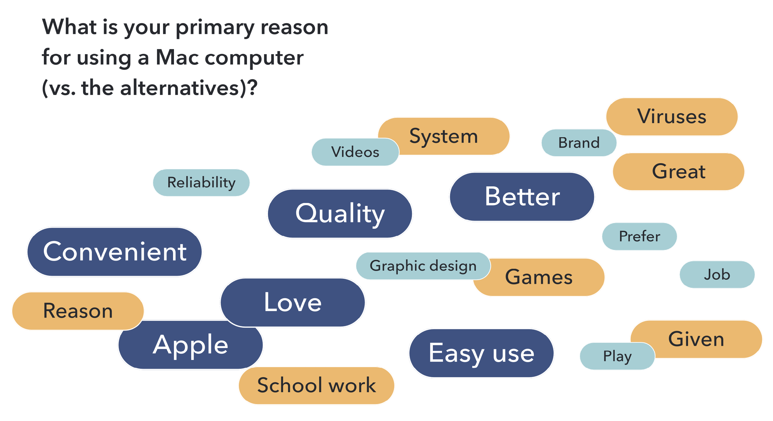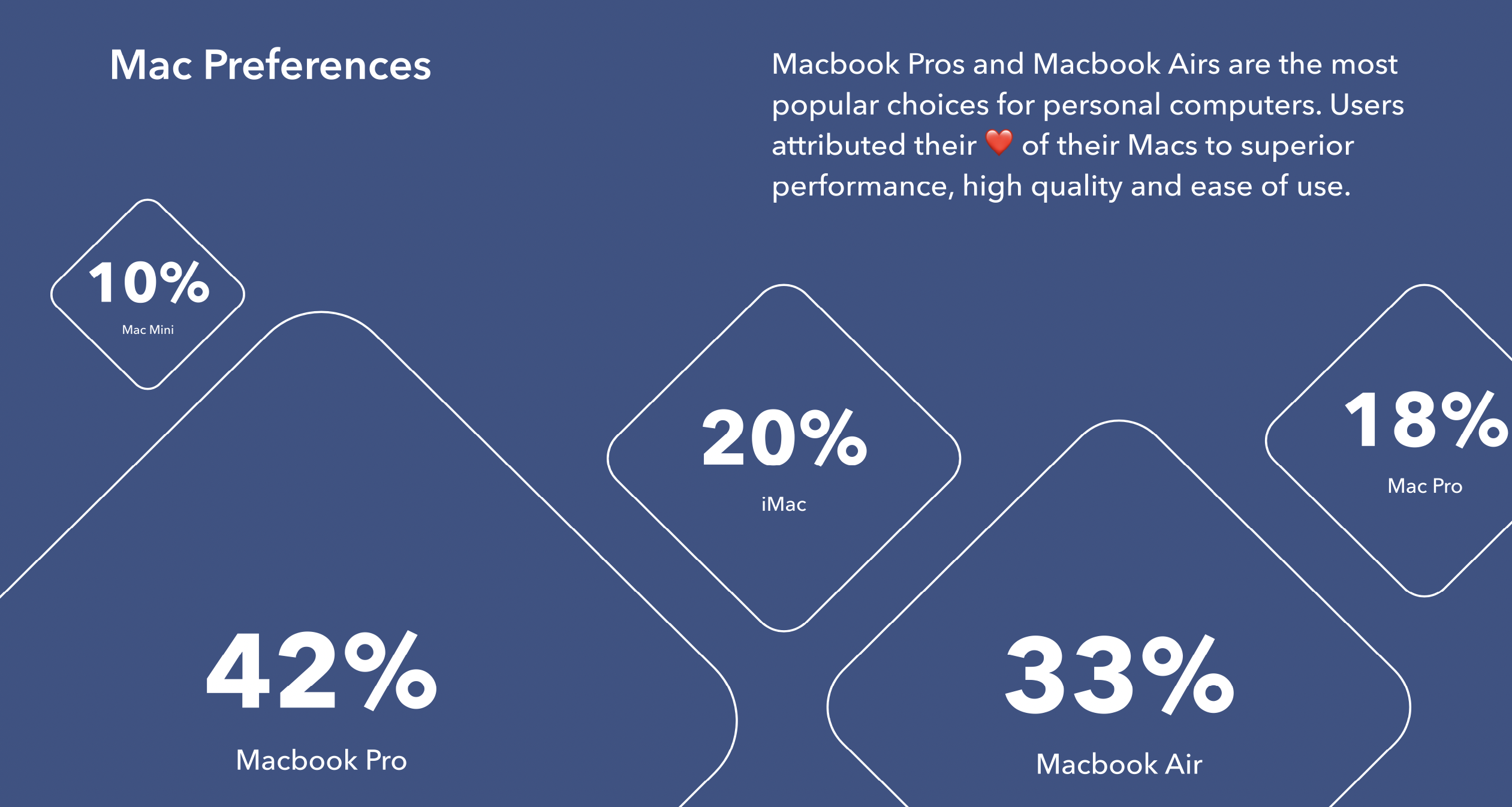 Finally, MacBook Air and Pro were the two most popular Macs for users in the survey and listed “Convenient,” “Love,” “Quality,” “Better,” and “Easy Use” as reasons for picking Mac over an alternative.