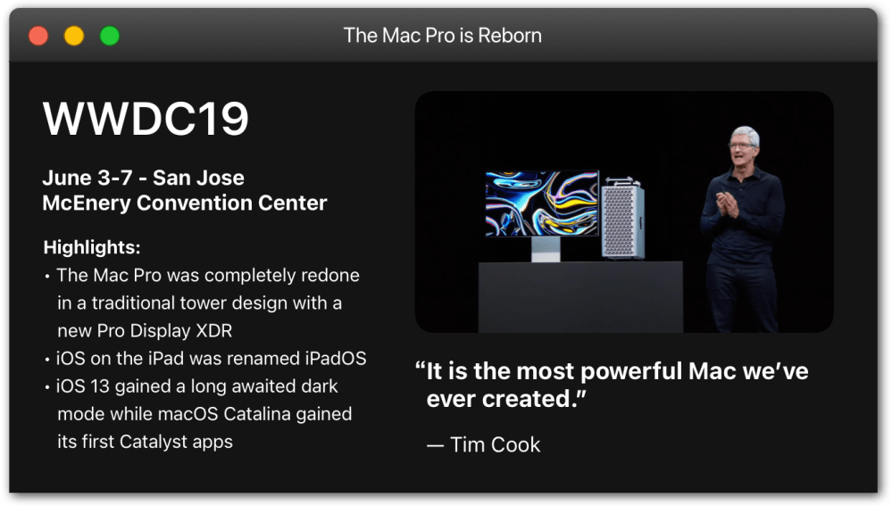 WWDC 2019 brought the reborn Mac Pro. After the debacle of the 2013 model, Apple promised that they were going to take the time to build an entirely new Mac Pro that met the needs of pro users during a roundtable with journalists and Apple executives. They delivered what they promised at WWDC 2019 with the redesigned Mac Pro and the Pro Display XDR.
