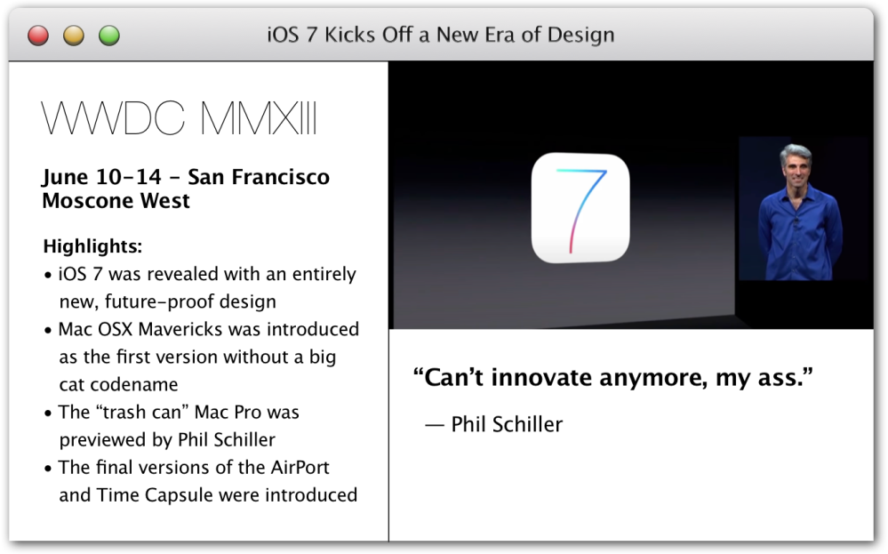 This was also the conference where Phil Schiller said, “Can’t innovate anymore, my ass,” after introducing the new Mac Pro. Of course, that Mac Pro was ill-fated but they didn’t know that at the time. He was absolutely right, he just probably shouldn’t have used that line on that particular product.