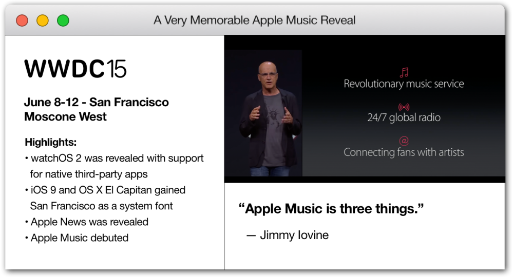 One of the weirdest reveals in WWDC history was in 2015 with the introduction of Apple Music. Not only was Apple Music a fairly strange choice for a developers conference, it was led by Beats executive Jimmy Iovine. Jimmy’s presentation was… well let’s just say it wasn’t a Stevenote.