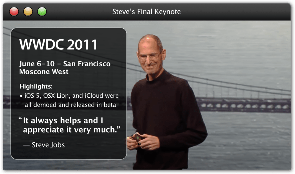 We didn’t know it at the time, but WWDC 2011 would be Steve’s very last keynote. He was visibly thinner but still in good spirits. He got a massive standing ovation at the start of the keynote and he thanked the crowd, telling them, “It always helps.”
