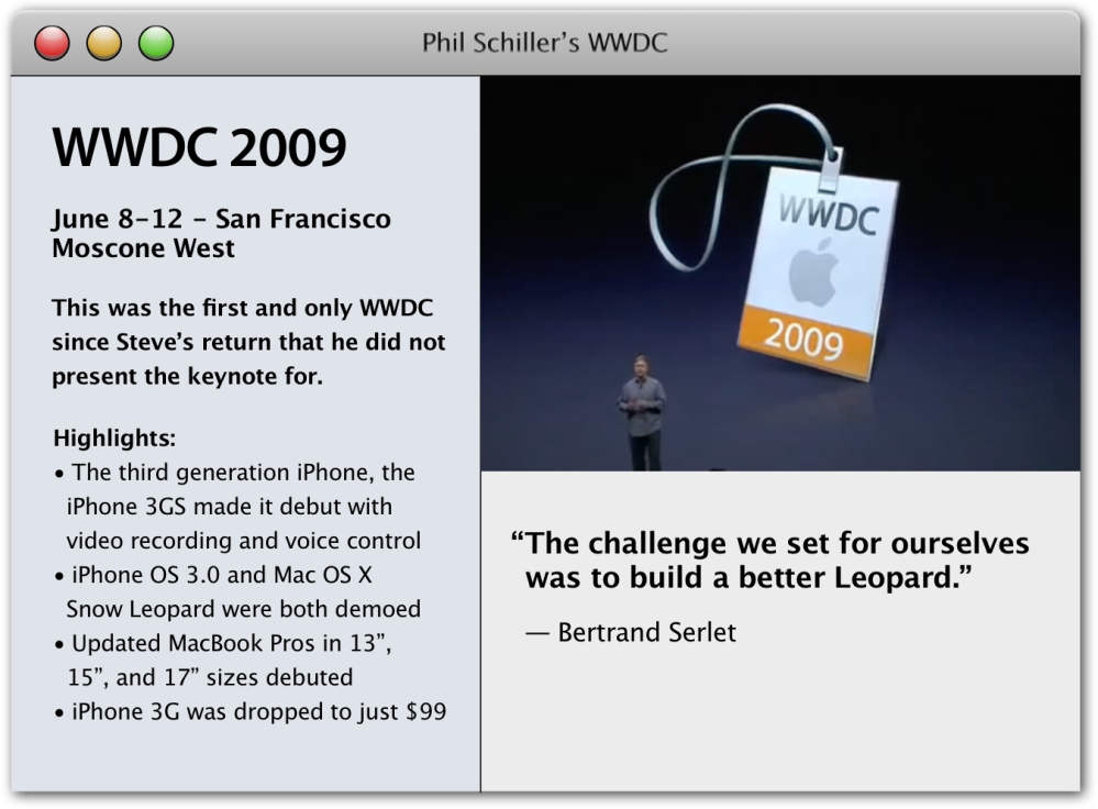 Steve had to go on medical leave for most of 2009, so like Macworld that year, WWDC 2009 was led by Phil Schiller. Alongside Scott Forstall and Bertrand Serlet, Phil introduced the next generations of iPhone OS and Mac OS X.