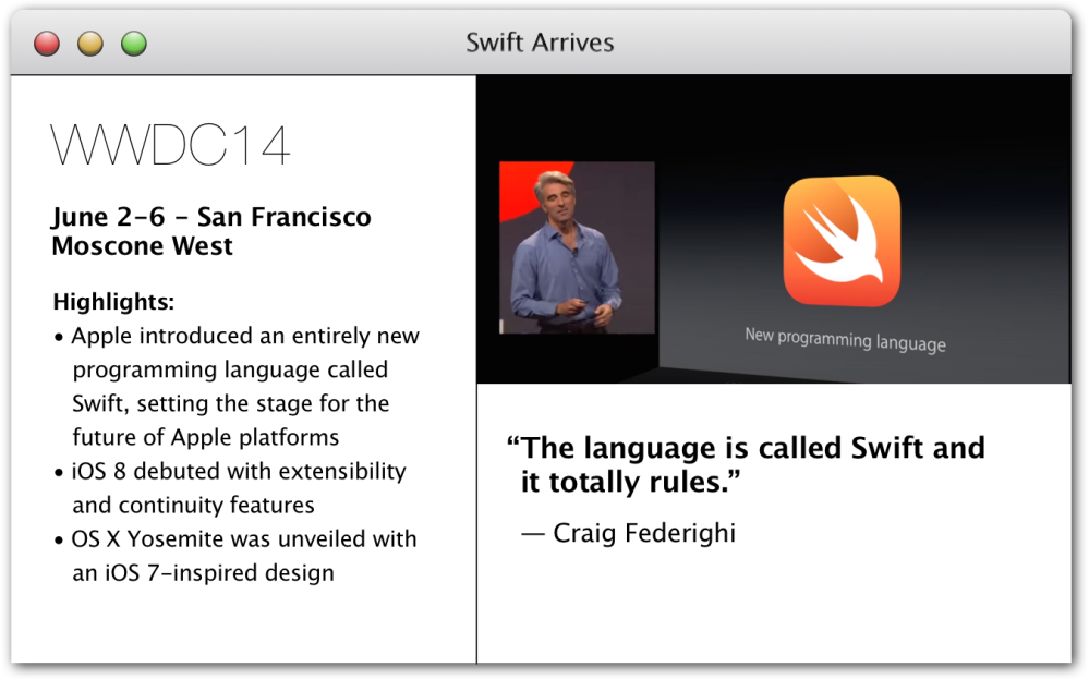WWDC 2014 was a major one. It marked the beginning of extensions on iOS and it marked the first big redesign for Mac OS since it had been introduced. But the real star of the show was Apple’s entirely new programming language.