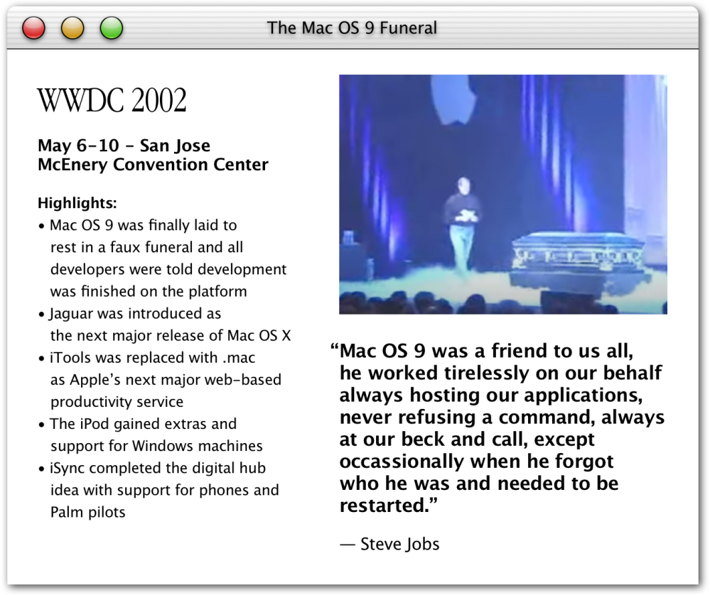 Over the course of the next five years, Steve would reinvent Apple. He and his crack team of designers, marketers, and engineers made it cool again. With the introduction of the colorful iMac, the iBook, the iPod, and Mac OS X, the company was back on a roll. By this time, Apple was healthy and able to have a little bit of fun now and then. Steve was known to have a good sense of humor and that was on full display at WWDC 2002. In fact, he came up with a very creative way to put Mac OS 9 to rest.