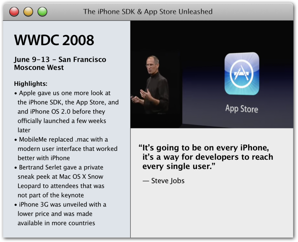When the iPhone was introduced at Macworld 2007, took the world by storm. It was clear that the product was going to be big and it was going to change things. Developers wanted to be able to ship their own apps for the iPhone but no solution was introduced in the original presentation. At WWDC 2007, Steve capped his keynote that had been primarily focused on Mac OS X Leopard by telling developers that their “sweet solution” for developers to build iPhone apps was web apps in Safari.