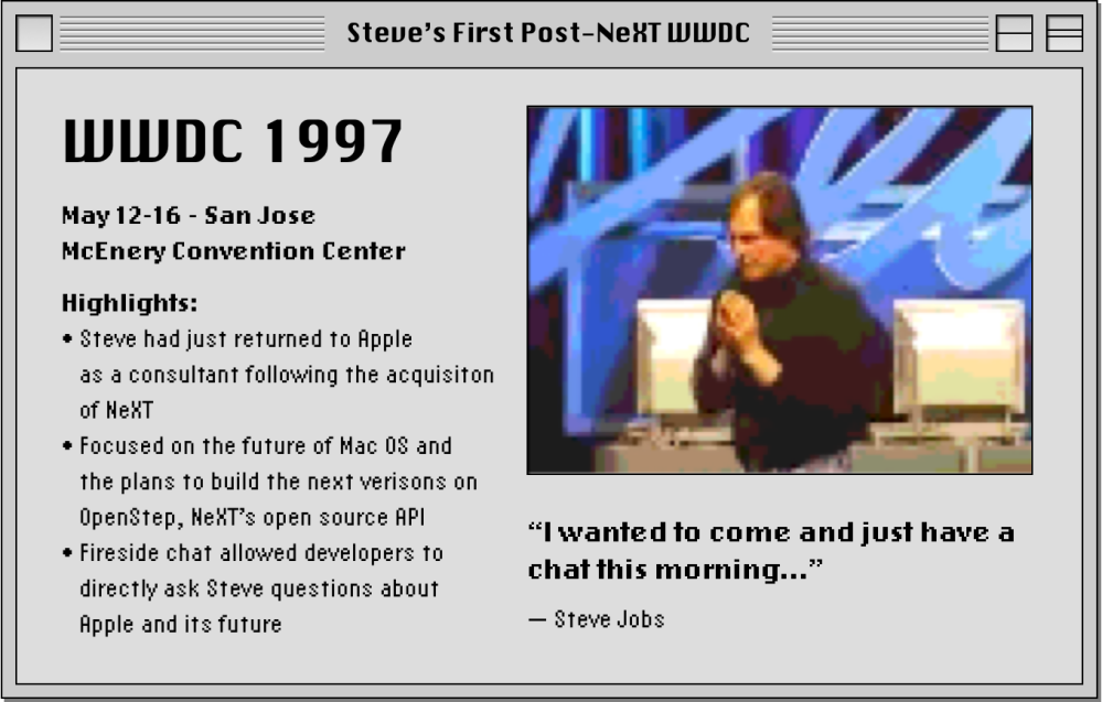 You can dive even deeper into the history of WWDC on the Apple Wiki which has breakdowns of each and every Apple developers conference, even predating Steve’s return in 1997.