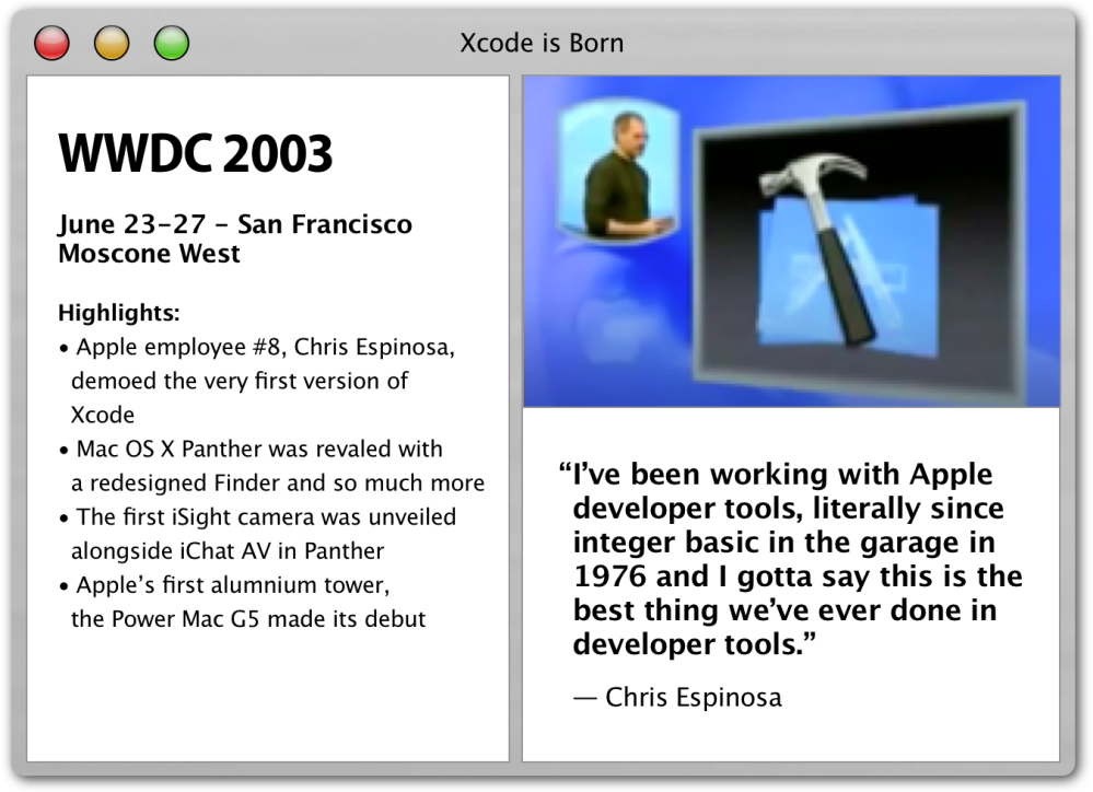 Did you know that Xcode didn’t actually exist until 2003? Yup, that’s right Apple announced the first version of Xcode at WWDC 2003 alongside Mac OS X Panther. Apple employee #8 Chris Espinosa, who was still at Apple at the time, demoed the new application and lauded it as the “best thing we’ve ever done in developer tools.” He would know, he had been at Apple since it was based in a garage.