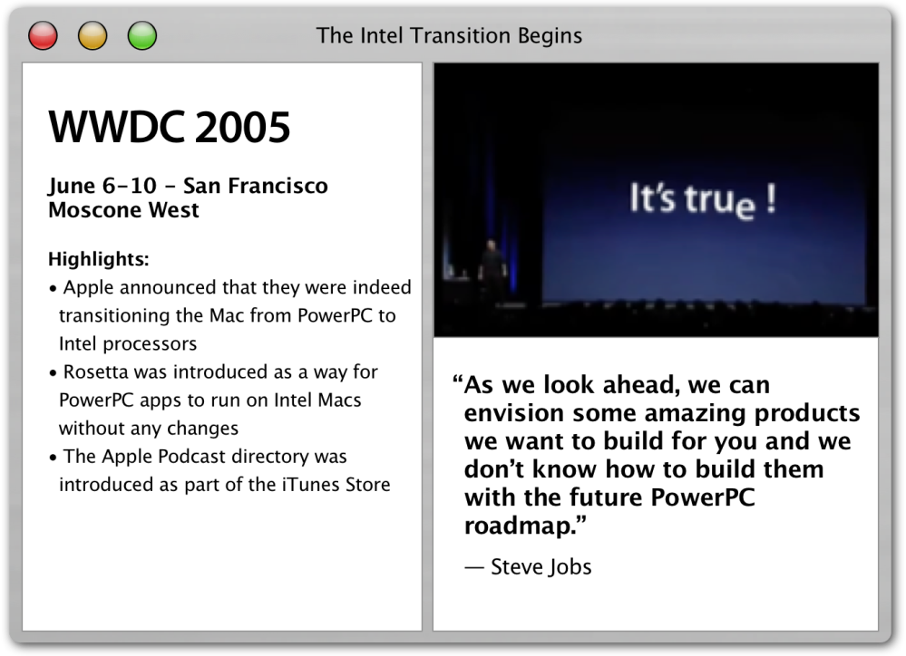 Rumors had swirled for a while that Apple might be transitioning the Mac from PowerPC to Intel processors. At WWDC 2005, Steve confirmed the rumor with what I consider an iconic slide that simply said “It’s true!” with a lowered e like the one in the Intel logo. The Intel transition ended up being the focus of this WWDC, and important technologies like Rosetta and Universal were introduced to help make the transition seamless for developers.