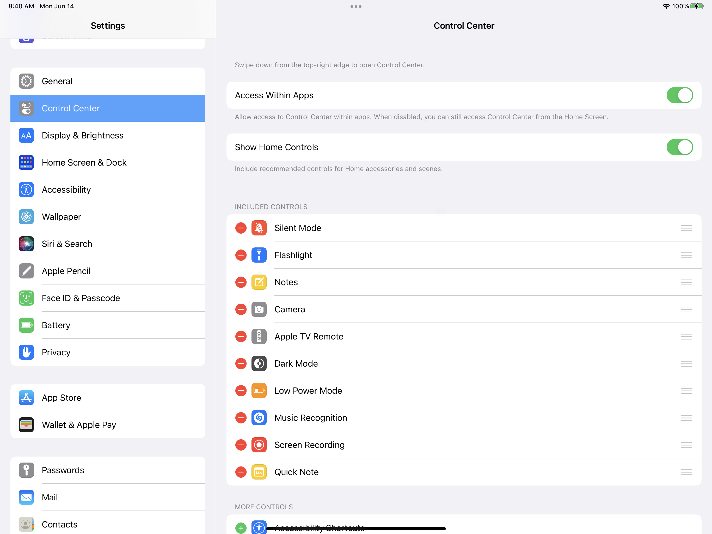The trick is to turn on the Quick Note button in Control Center. Start by going to Settings > Control Center. Check that “Access within Apps” is enabled, then add Quick Note to your list of Control Center tiles.