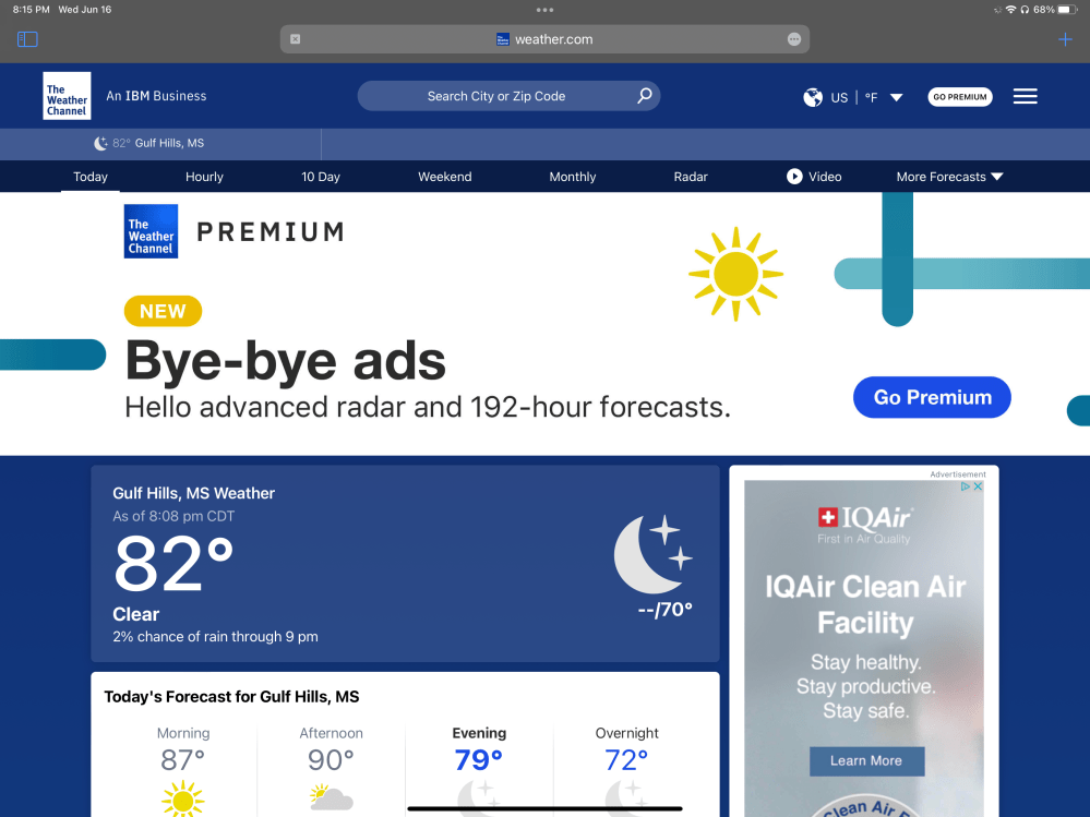 The top of the Weather app for iPad includes a giant banner for a subscription version with more features and fewer ads. I missed the announcement about a paid version of the Weather app, but Apple is really into services these days so it’s no surprise.