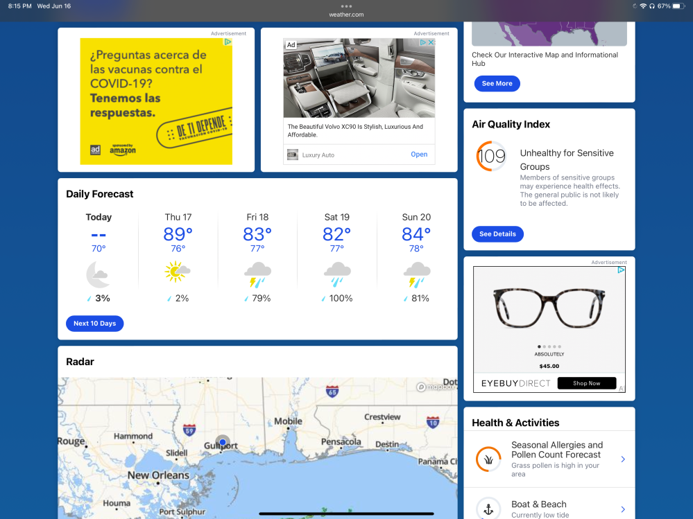 The perks of Apple’s Weather app for iPad don’t end there. You can confirm your suspicion that the yellow stuff covering your car is actually pollen. I live a few minutes from the beach so it’s also good to see tide levels. That’s the power of iPad, people.