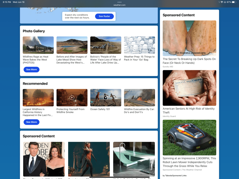 The Weather app for iPad also features some really cool photo galleries of weather conditions around the world. These are attached to weather-related news stories sort of like how Stocks has business-related news stories, but stories in the iPad Weather app don’t use Apple News for some reason.