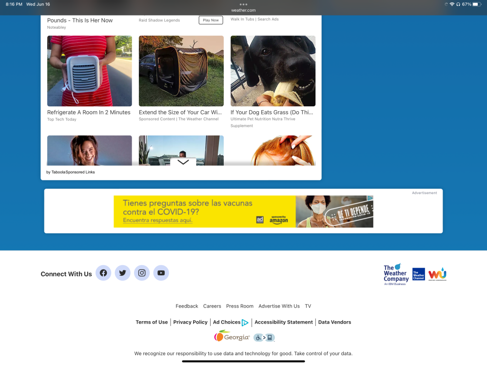 Weather news isn’t the only kind of stories you can learn about in the Weather app for iPad. There’s an adorable puppy story, a suggestion for attaching a pop-up tent to your car, and something about turning your room into a fridge. Fascinating!