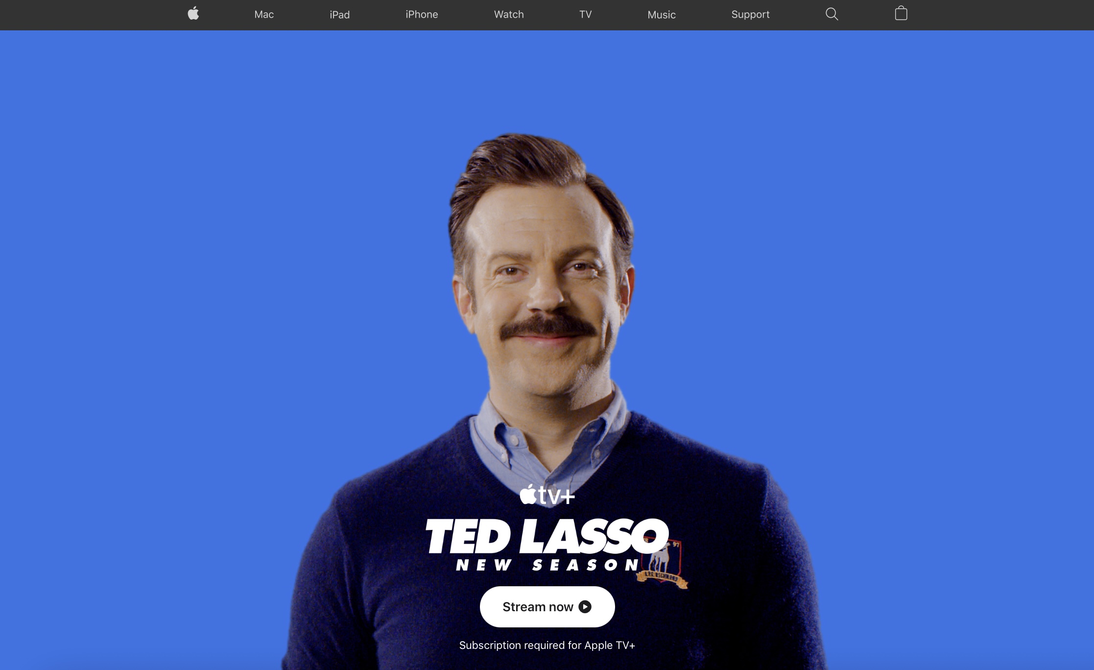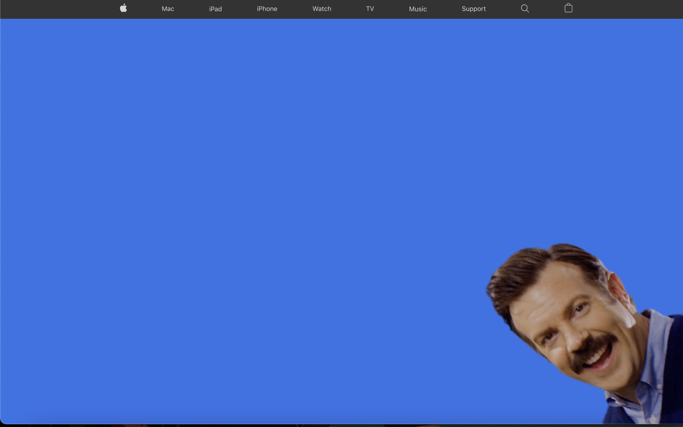 Notably, while Apple often uses homepage takeovers to celebrate various occasions, it usually still includes features and imagery for its products and services below the top feature. With the Ted Lasso homepage takeover, there’s nothing else on the homepage except the link directory to the different parts of the website at the very bottom.