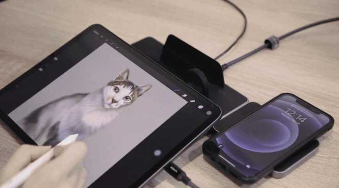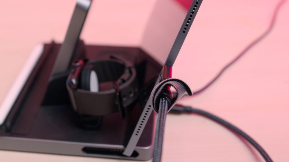 As you’ll see in the image above, the Q5 can also double as an ergonomic, non-slip surface for iPad. This allows you to prop up the device at different and more comfortable easel-like viewing angles, while keeping the device completely stable for use with Apple Pencil and other tasks that aren’t suitable for an upright position that most stands offer. As shown in our video and the image above, you can also move the iPhone charger to the side of the device, allowing you to continue charging devices while using the rest of the Q5 as an iPad stand.