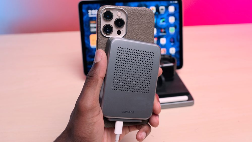 One of the coolest features of the OMNIA Q5 is the iPhone wireless charger. At first glance, it looks like a typical vertical wireless charger, but you can actually remove this component from the main chassis. It connects to the base with pins, and next to those pins is another USB type-c charger, which means you can use this as a standalone portable wireless charger if you’d like.