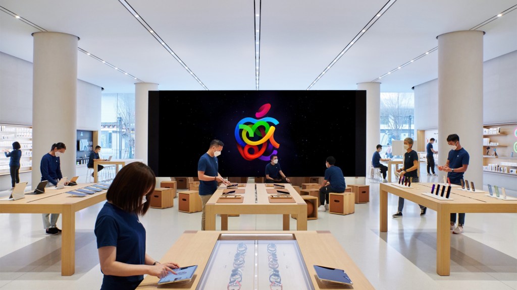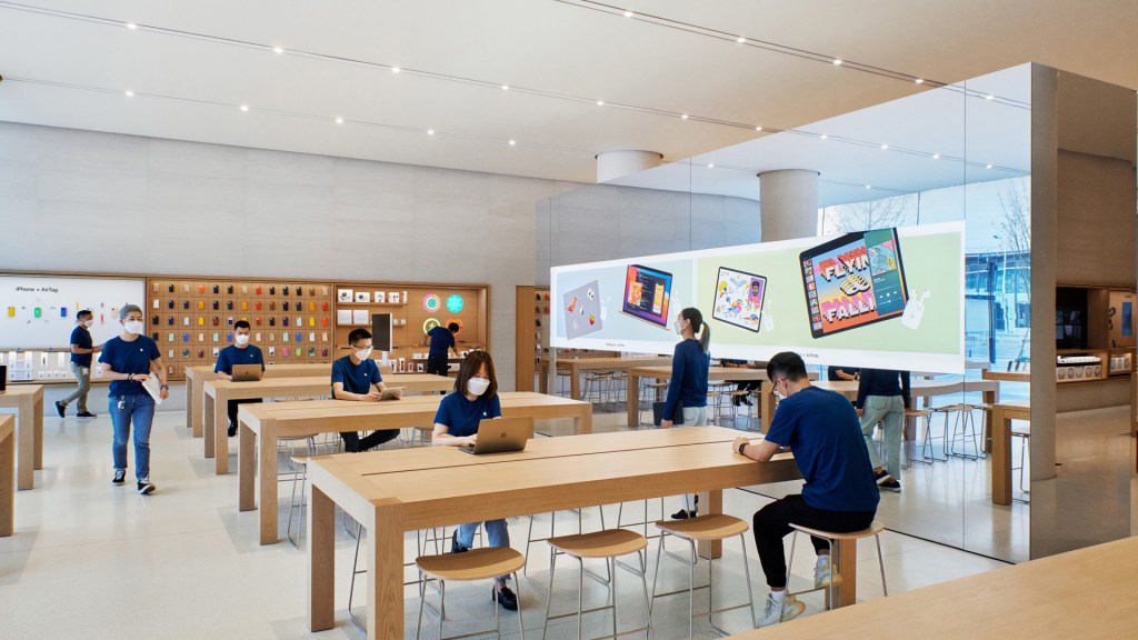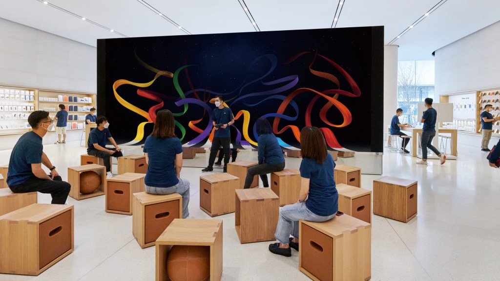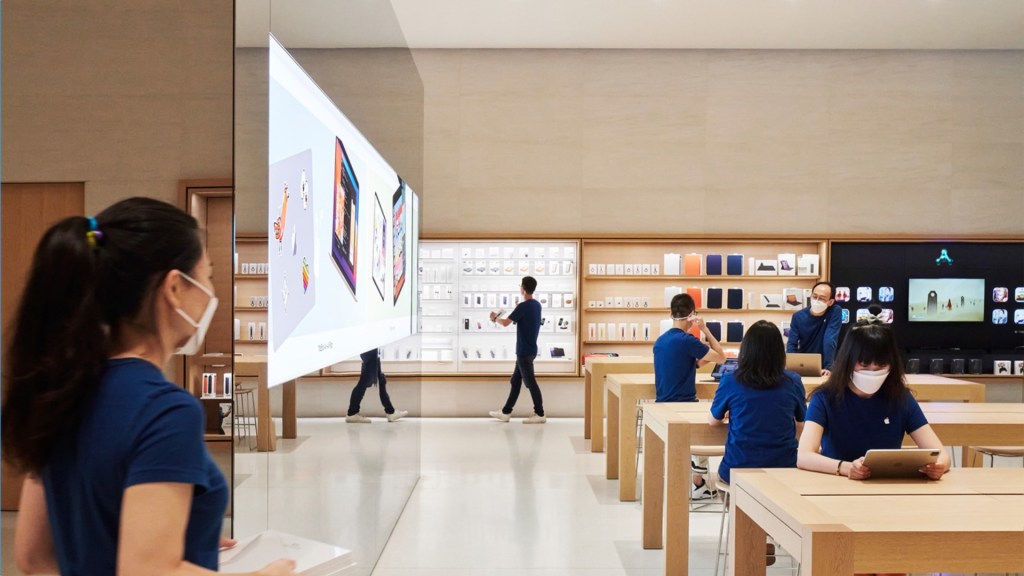 According to the press release shared by Apple, “customers who walk into the retail store will see a unique double-layer glass curtain wall design, mirror glass with gradient effects will be integrated into the exterior wall and can transform different times in one day and in four seasons.”