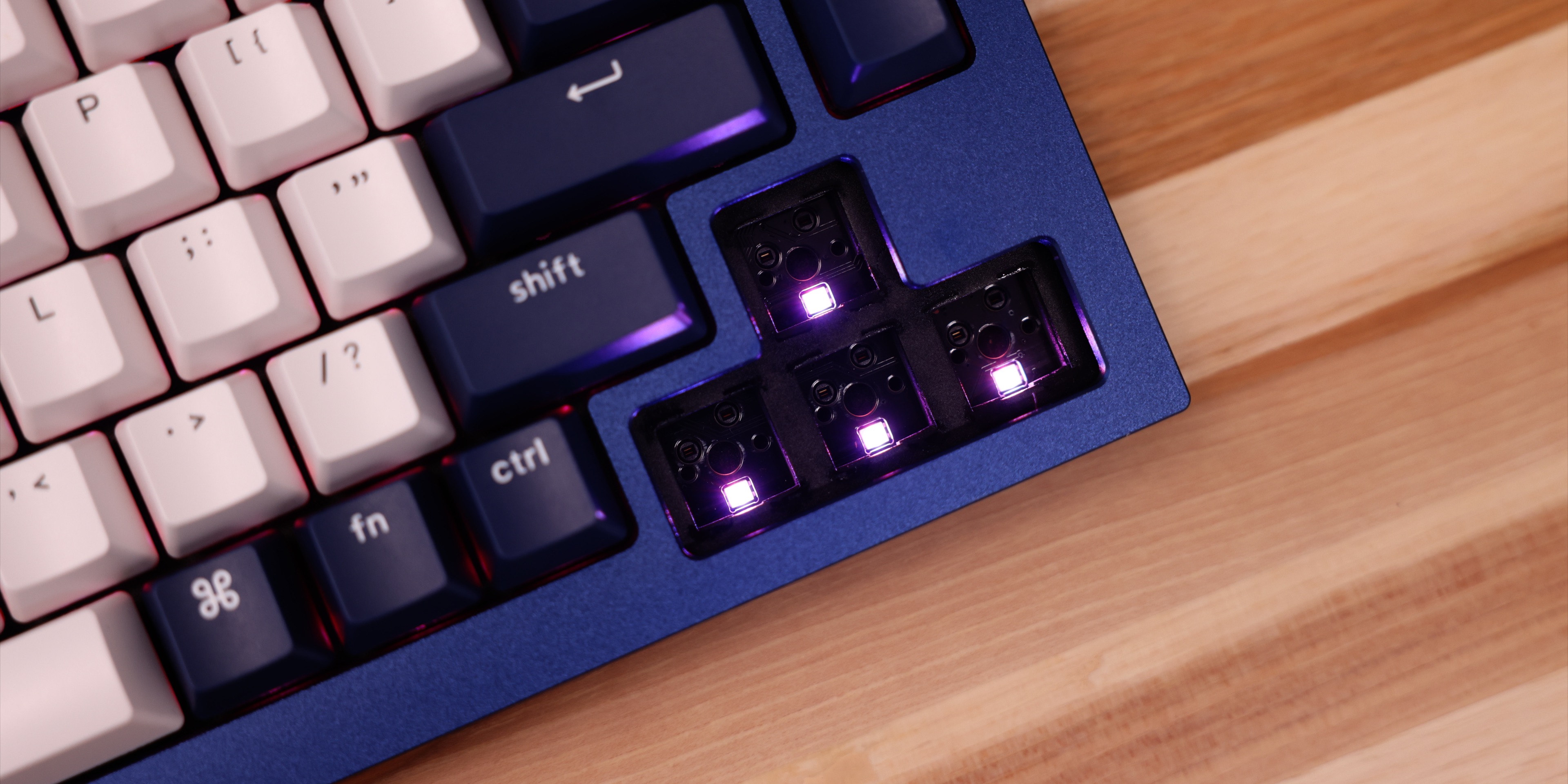 The Q1 includes south-facing RGB backlights under each key, which positions them towards the typer to make them easier to discern. In turn, the Gateron Phantom switches are designed with small cavities to allow the RGB lights to shine through.